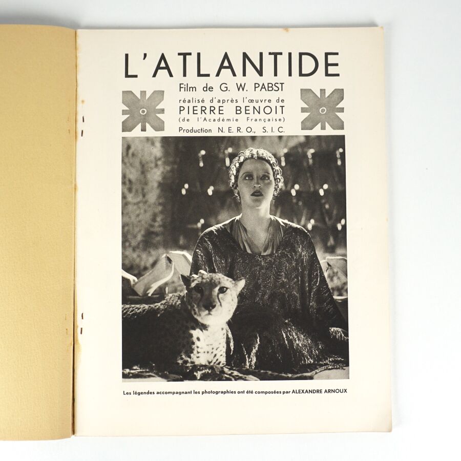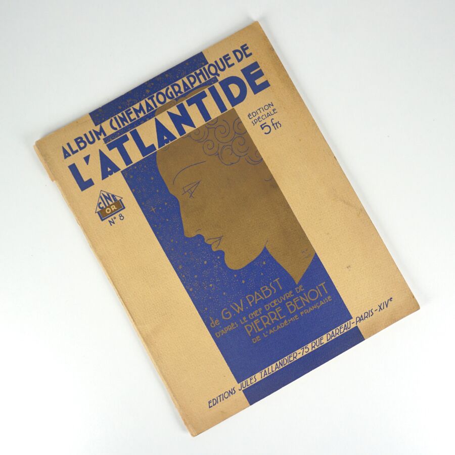 Cinéma. Album cinématographique de l'Atlantide de G.W. PABST d'après le chef-d'oeuvre de Pierre BENOIT. Paris, Jules Tallandier, [c. 1932]. In-folio broché, couverture illustrée d'un belle composition Art Déco en bleu et or. N°8 de la revue Ciné Or (édition spéciale). Petites usures au dos. Nombreuses reproductions de scènes du film.