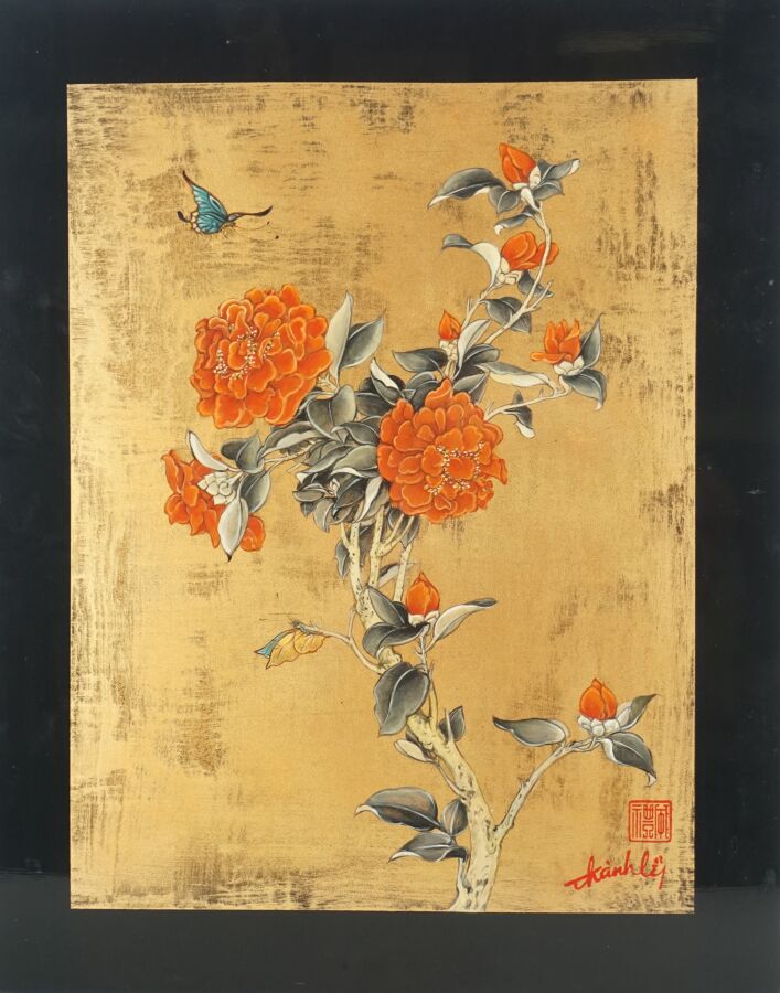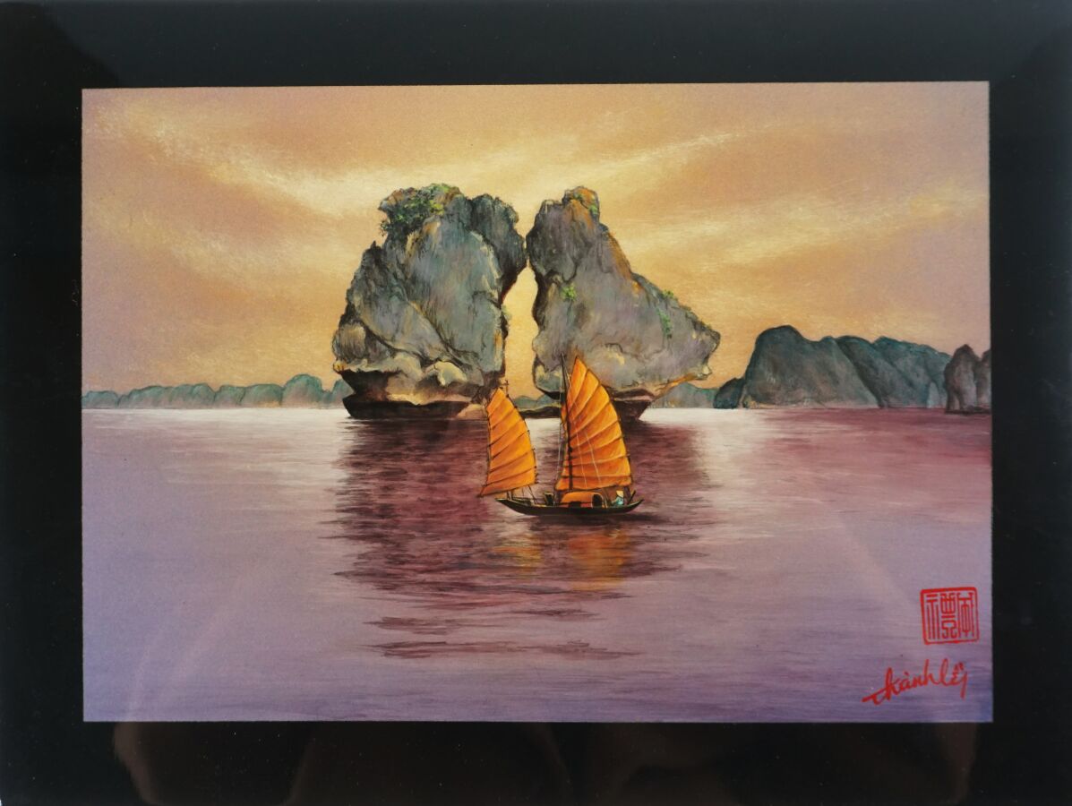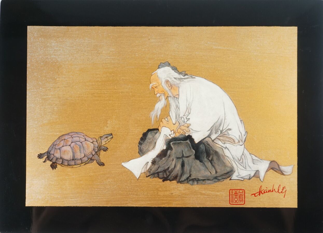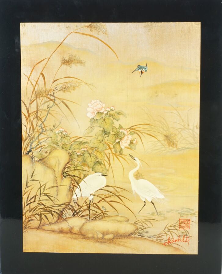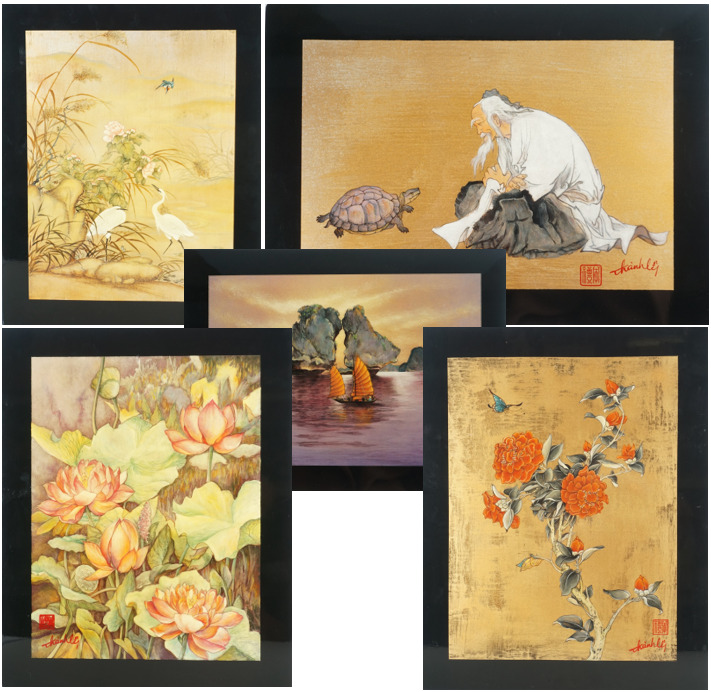 Cinq impressions occidentales sur panneau en laque noire à décor polychromes d'échassiers, vieillard et sa tortue, deux compositions florales et baie d'Along, portent les signatures de Thanh Ley, Vietnam, travail moderne, Dim diverses. 28,5 x 39 cm ; 30 x 40 cm, 50 x 40 cm (petit accident au panneau vieillard et tortue, légères rayures).