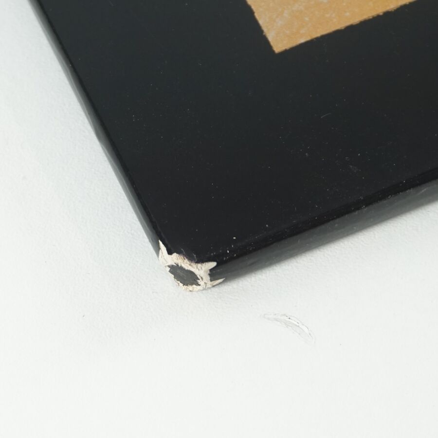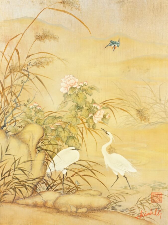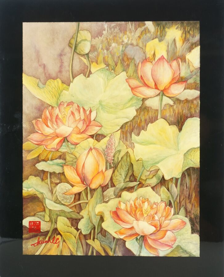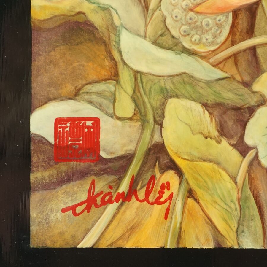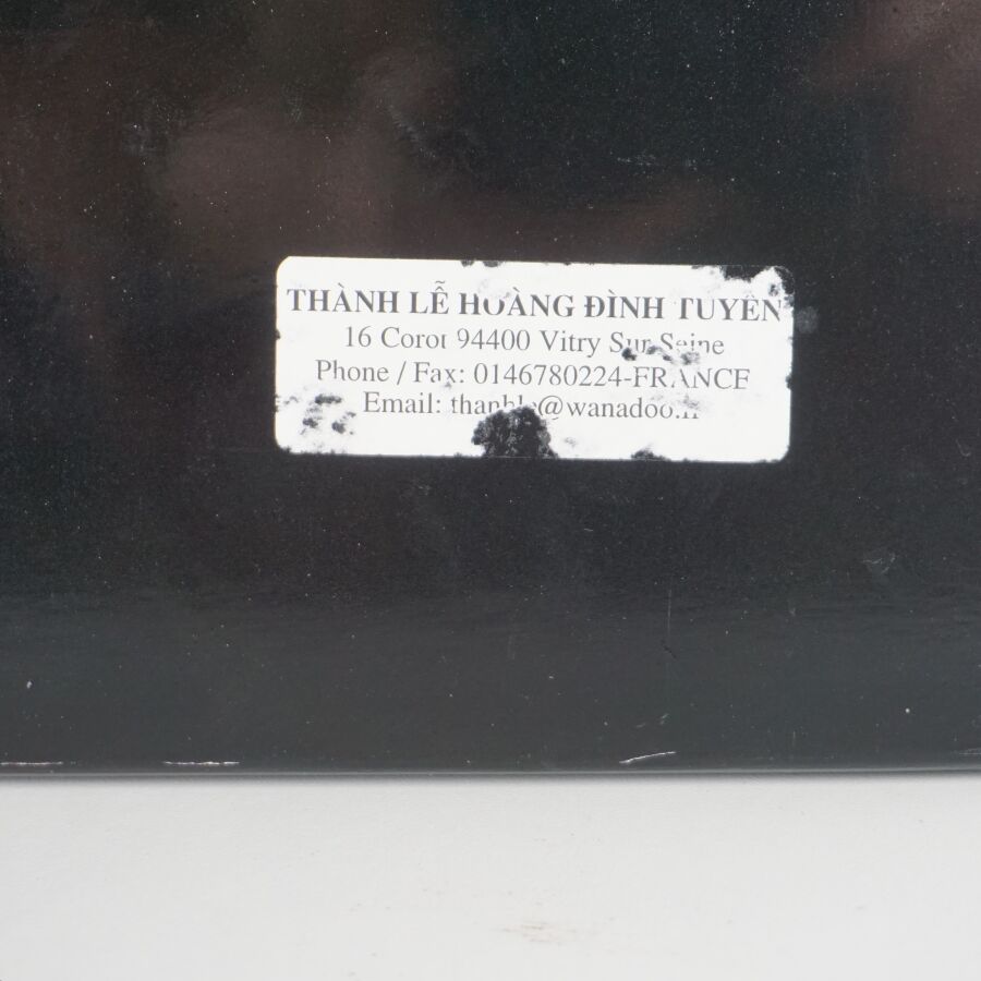 Cinq impressions occidentales sur panneau en laque noire à décor polychromes d'échassiers, vieillard et sa tortue, deux compositions florales et baie d'Along, portent les signatures de Thanh Ley, Vietnam, travail moderne, Dim diverses. 28,5 x 39 cm ; 30 x 40 cm, 50 x 40 cm (petit accident au panneau vieillard et tortue, légères rayures).