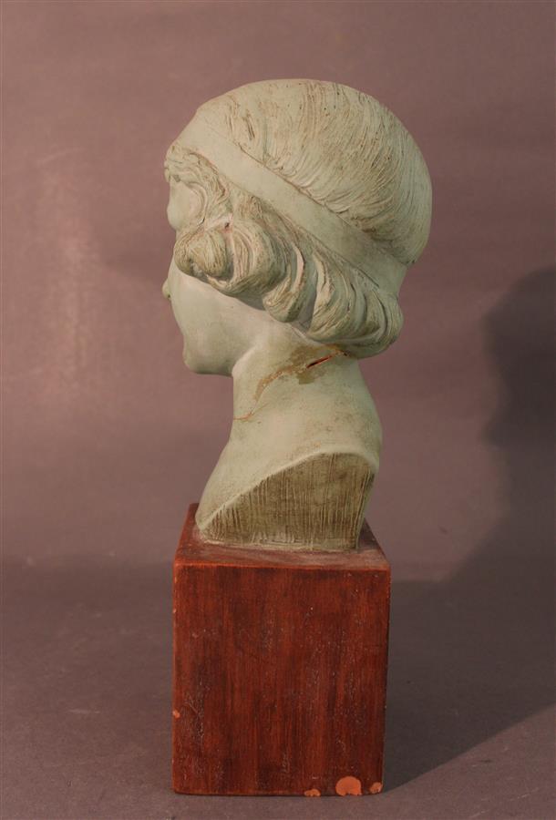 Claude MIRVAL (XIX-XXe), "Buste de jeune femme au bandeau", terre-cuite patine verte et brune, signée au dos, socle solidaire, circa 1925, H. 33 cm (tête cassée recollée, petits éclats)