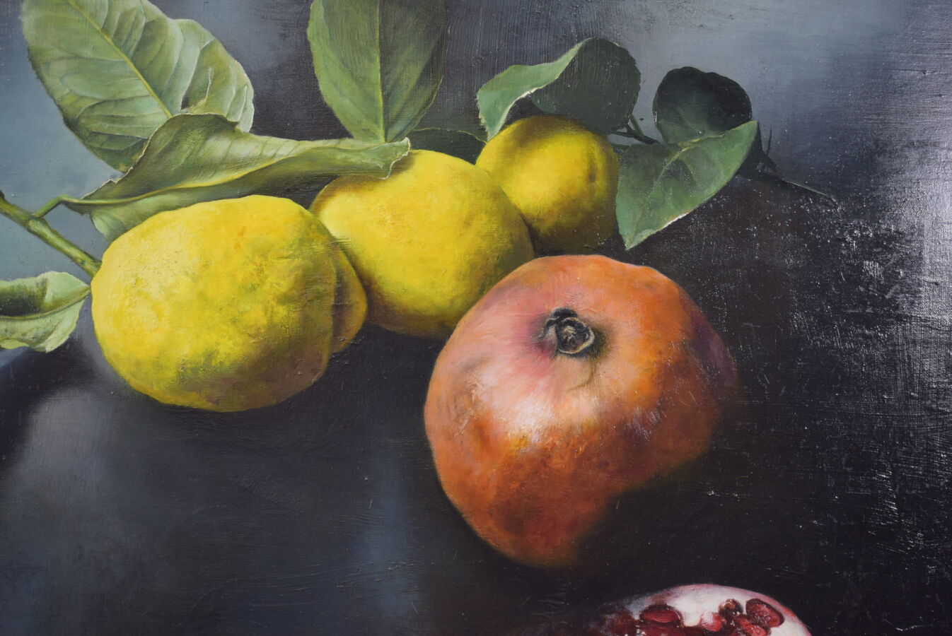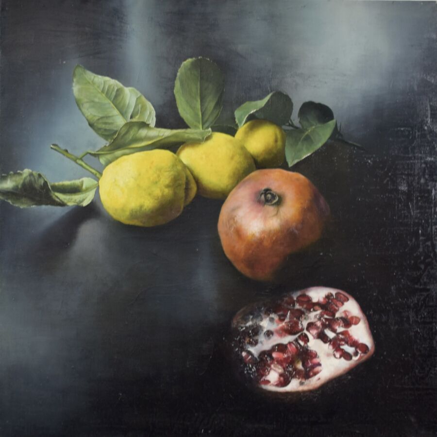 Clément ROSENTHAL (1956), "Nature morte aux grenades et citrons", huile sur toile, signée, datée et numérotée au dos, 80 x 81 cm.