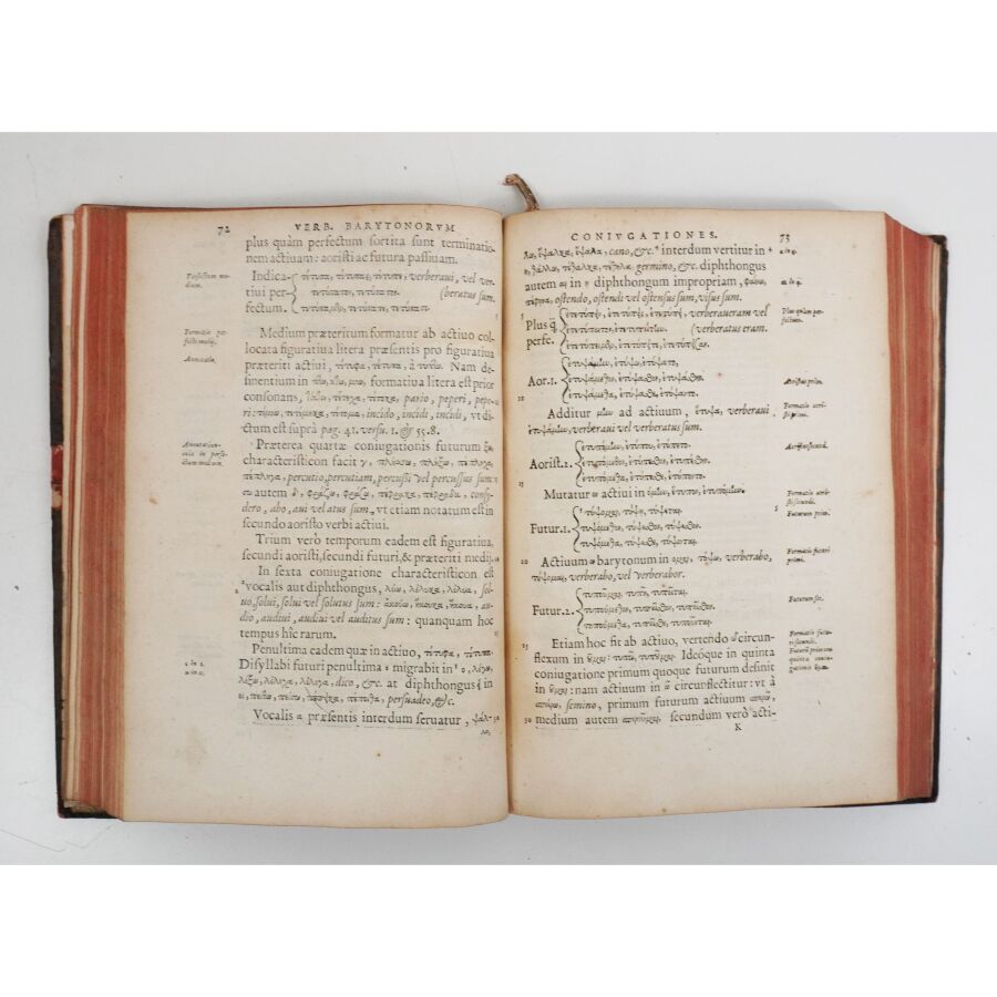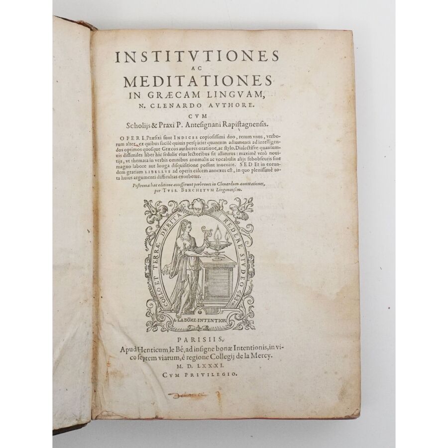 CLEYNAERTS (Nicolas). Institutiones ac Meditationes in Graecam linguam [...] Paris, Henri Le Bé, 1581. In-4 de [54] ff., 414 pp., [1] f., 23-[1] pp. Veau brun, dos à nerfs orné (reliure de l'époque). Coiffes, mors et coins usagés. Larges mouillures claires par endroits, fines galeries de vers en marge inf. de qqs ff.