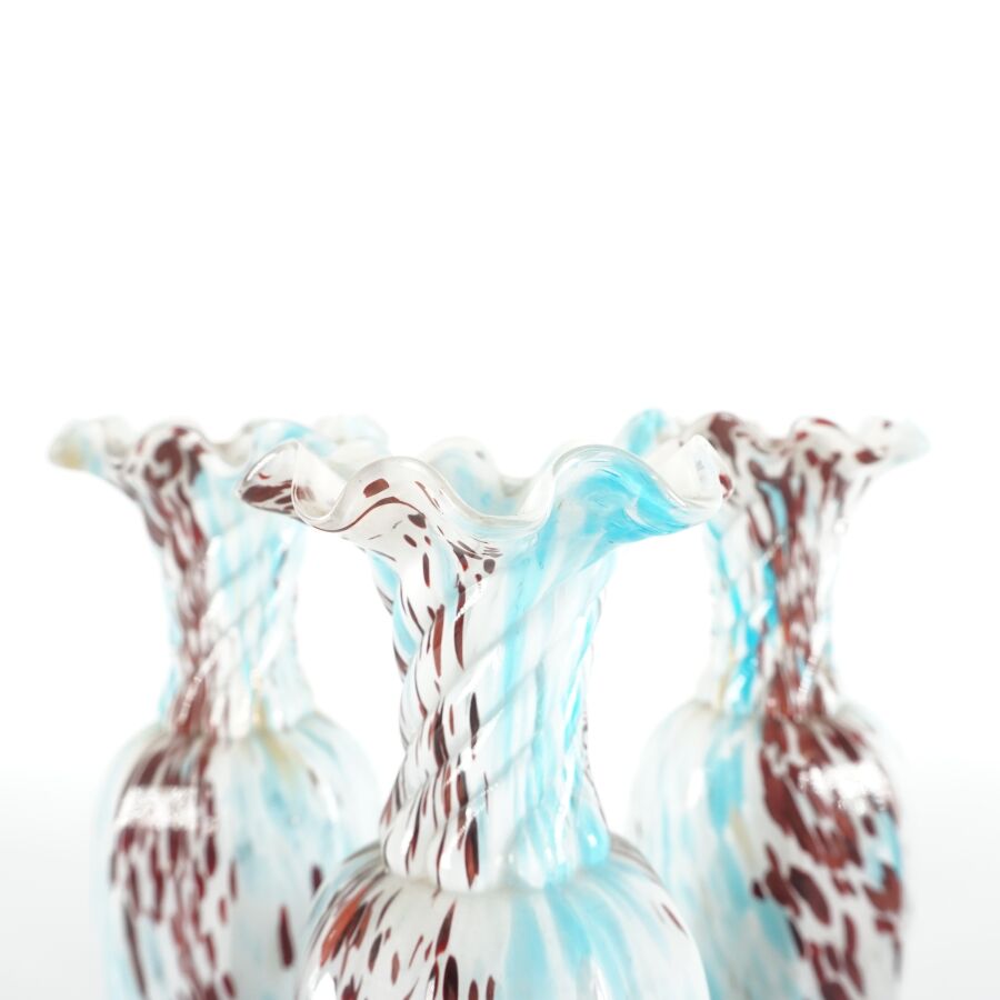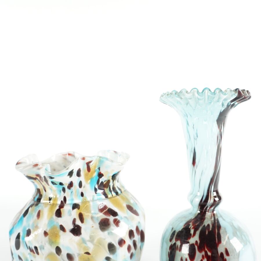 CLICHY : Ensemble de cinq vases à col chantourné, en verre à décor moucheté en bleu et brun, H. de 13 à 19 cm.