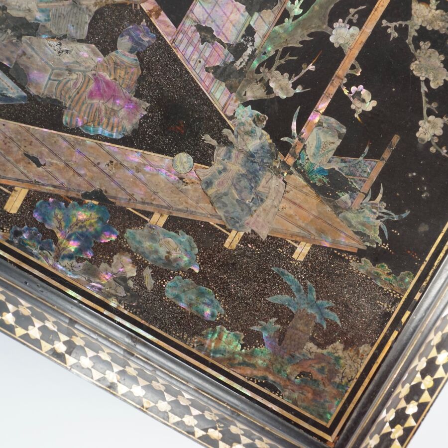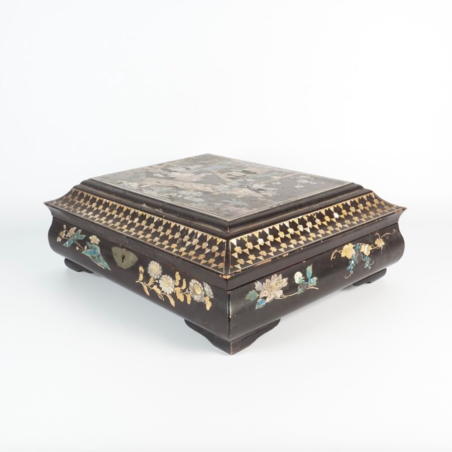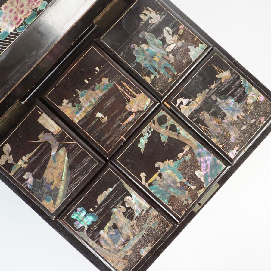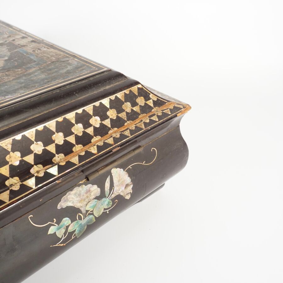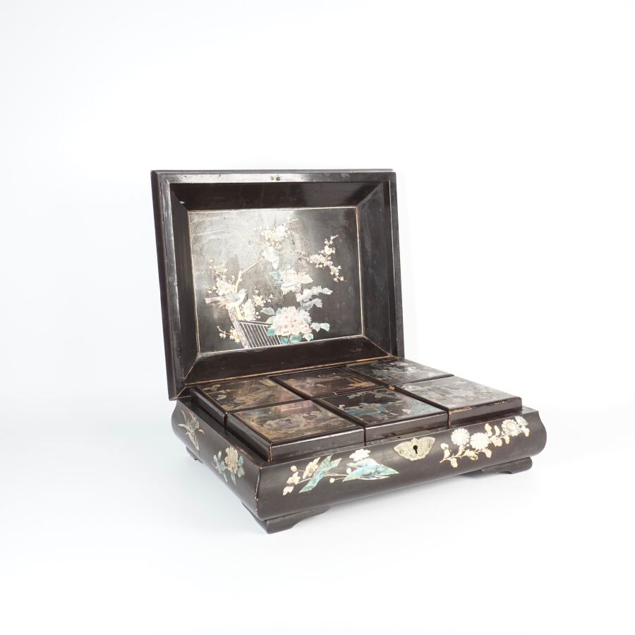 Coffret à jeux en bois laqué finement décoré de burgau de nacre polychrome représentant sur le couvercle une leçon de musique à l'intérieur d'un pavillon entouré de cerisiers ou prunus en fleurs, le pourtour orné d'une marqueterie de nacre, ouvrant à l'intérieur sur six petites boîtes, Indochine, fin du 19ème siècle, circa 1880 - 1900, Dim. 13 x 35.5 x 27.5 cm (quelques sauts de laque et manques).