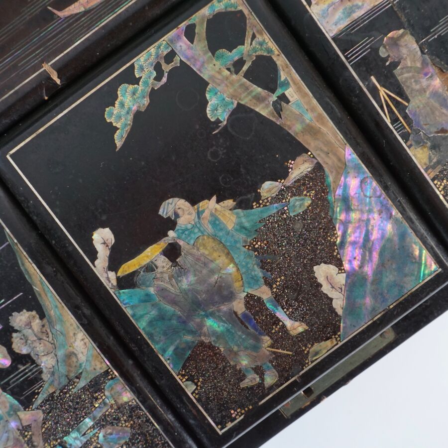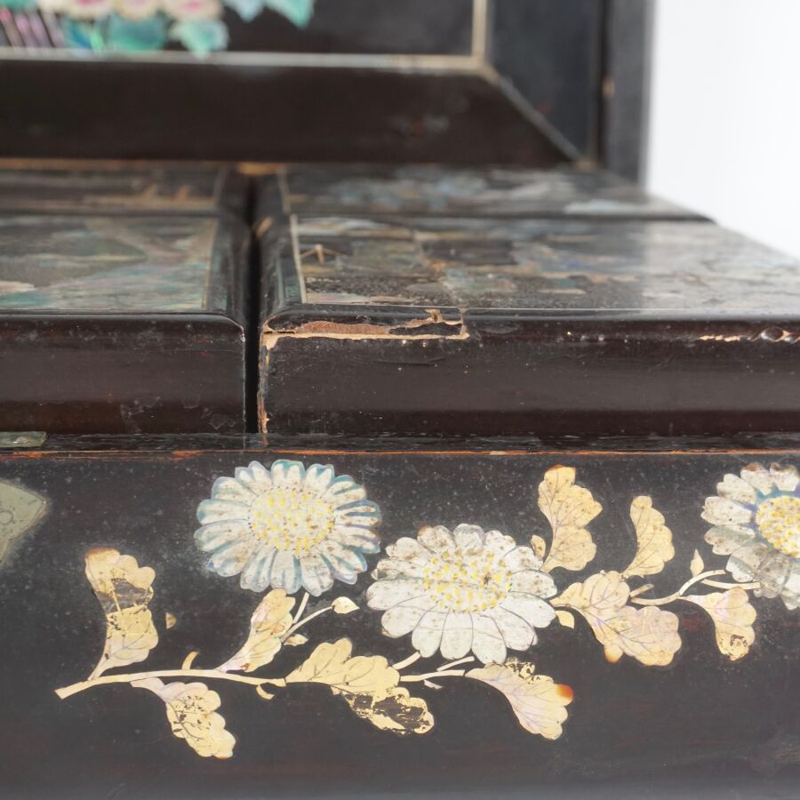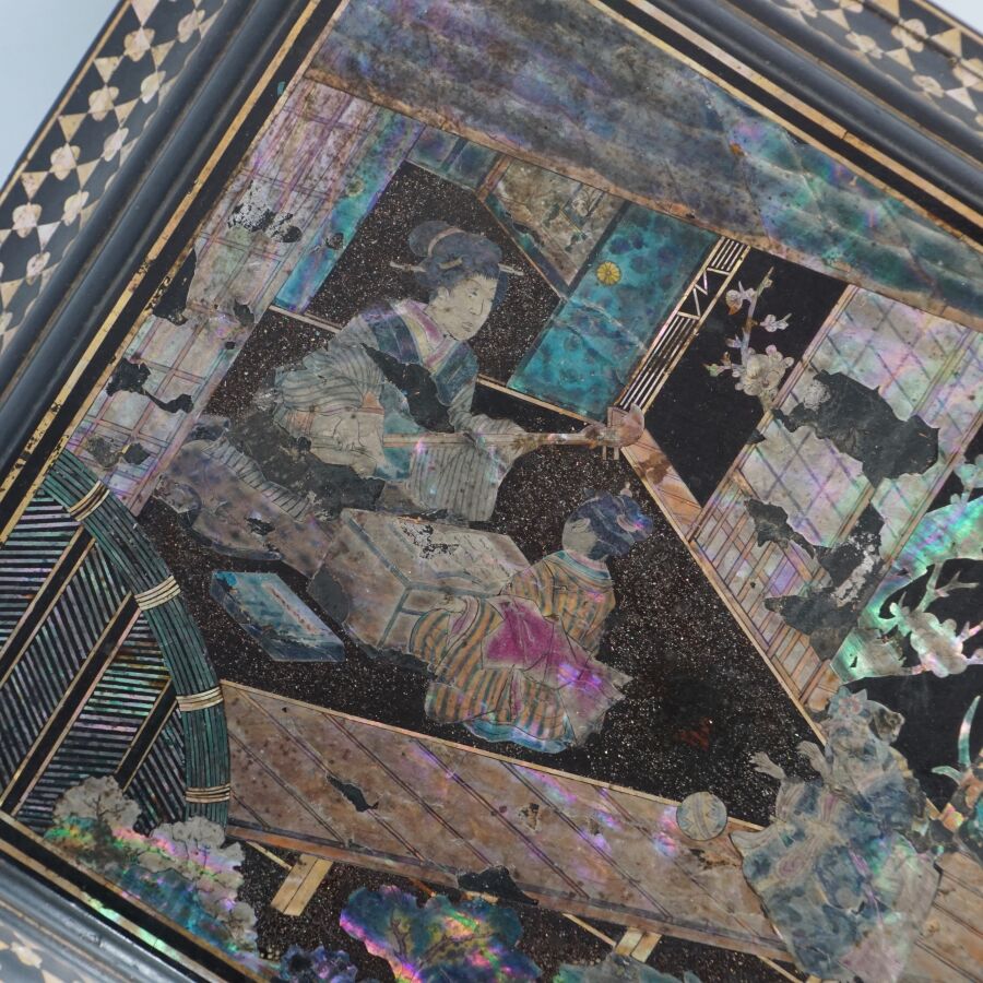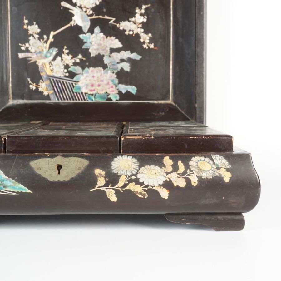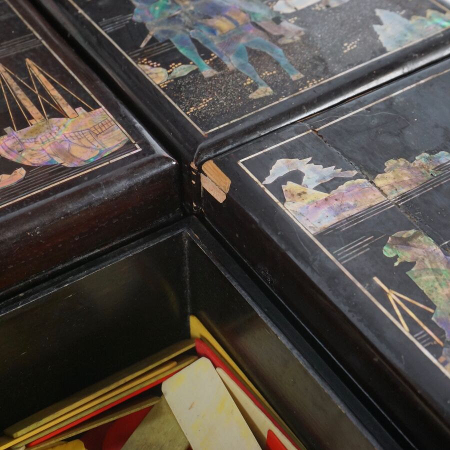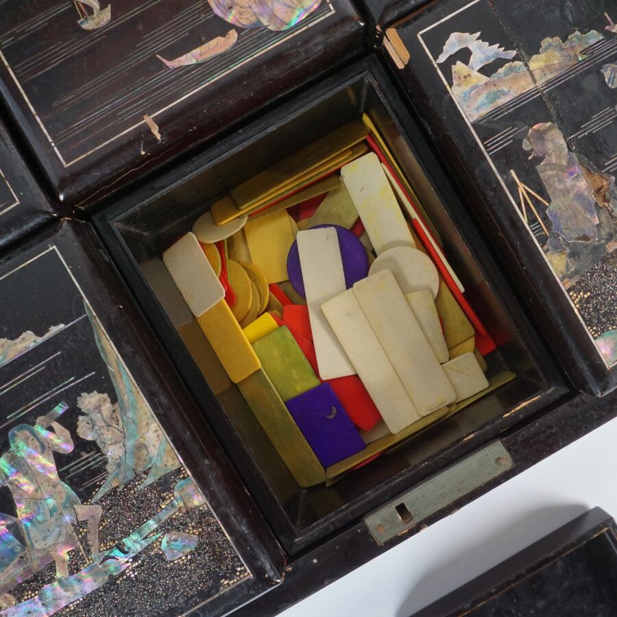 Coffret à jeux en bois laqué finement décoré de burgau de nacre polychrome représentant sur le couvercle une leçon de musique à l'intérieur d'un pavillon entouré de cerisiers ou prunus en fleurs, le pourtour orné d'une marqueterie de nacre, ouvrant à l'intérieur sur six petites boîtes, Indochine, fin du 19ème siècle, circa 1880 - 1900, Dim. 13 x 35.5 x 27.5 cm (quelques sauts de laque et manques).
