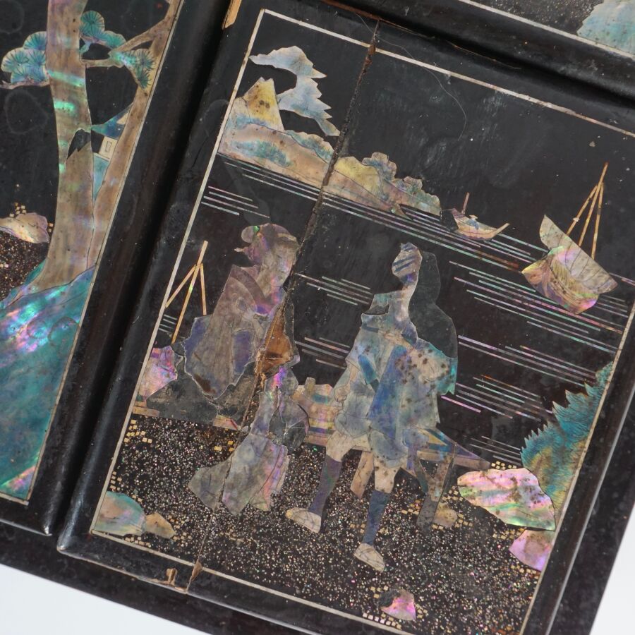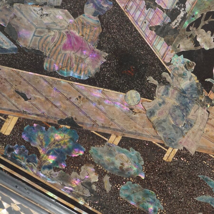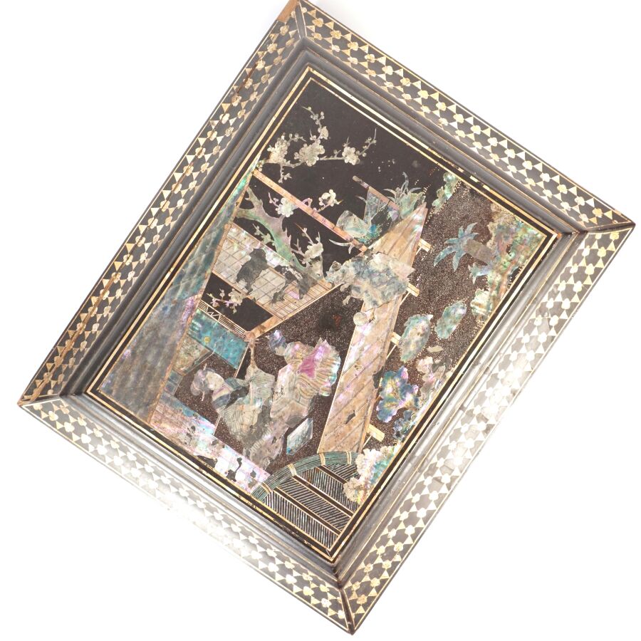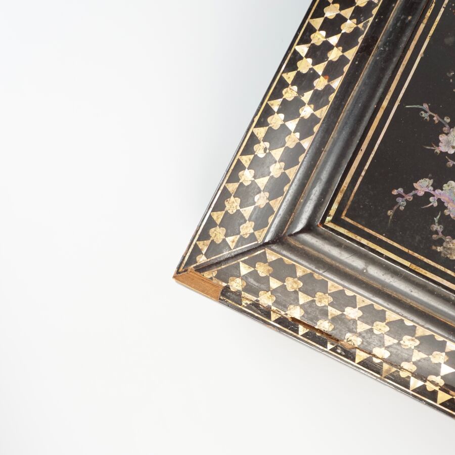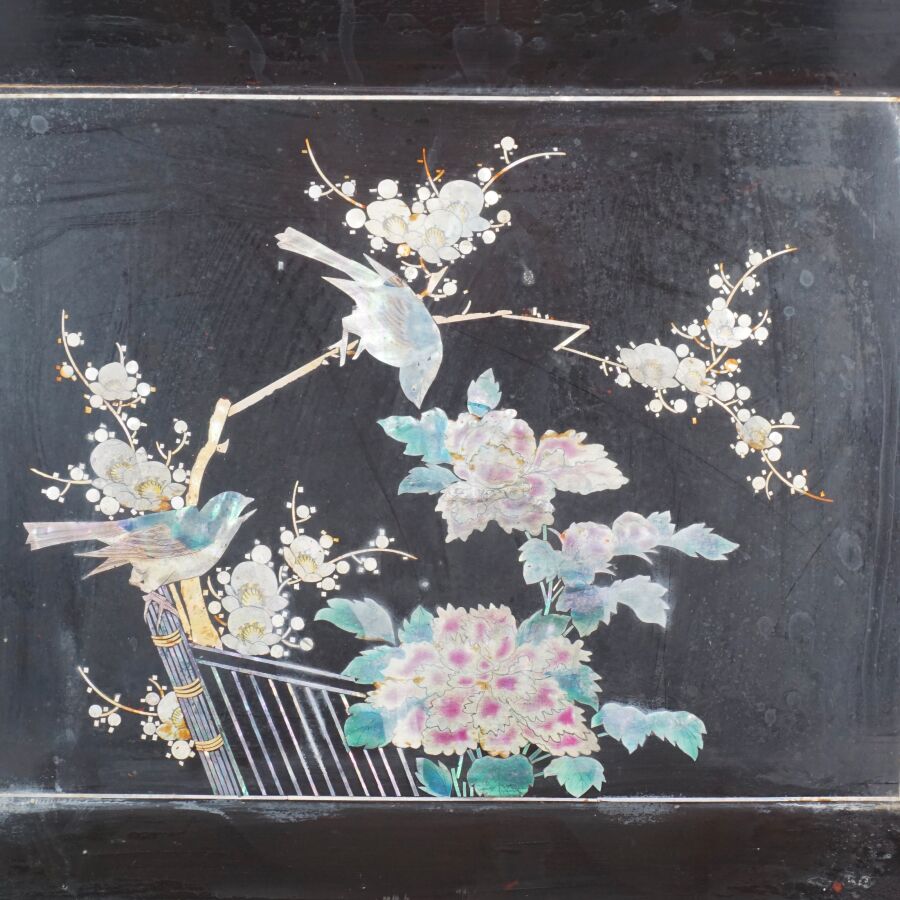 Coffret à jeux en bois laqué finement décoré de burgau de nacre polychrome représentant sur le couvercle une leçon de musique à l'intérieur d'un pavillon entouré de cerisiers ou prunus en fleurs, le pourtour orné d'une marqueterie de nacre, ouvrant à l'intérieur sur six petites boîtes, Indochine, fin du 19ème siècle, circa 1880 - 1900, Dim. 13 x 35.5 x 27.5 cm (quelques sauts de laque et manques).