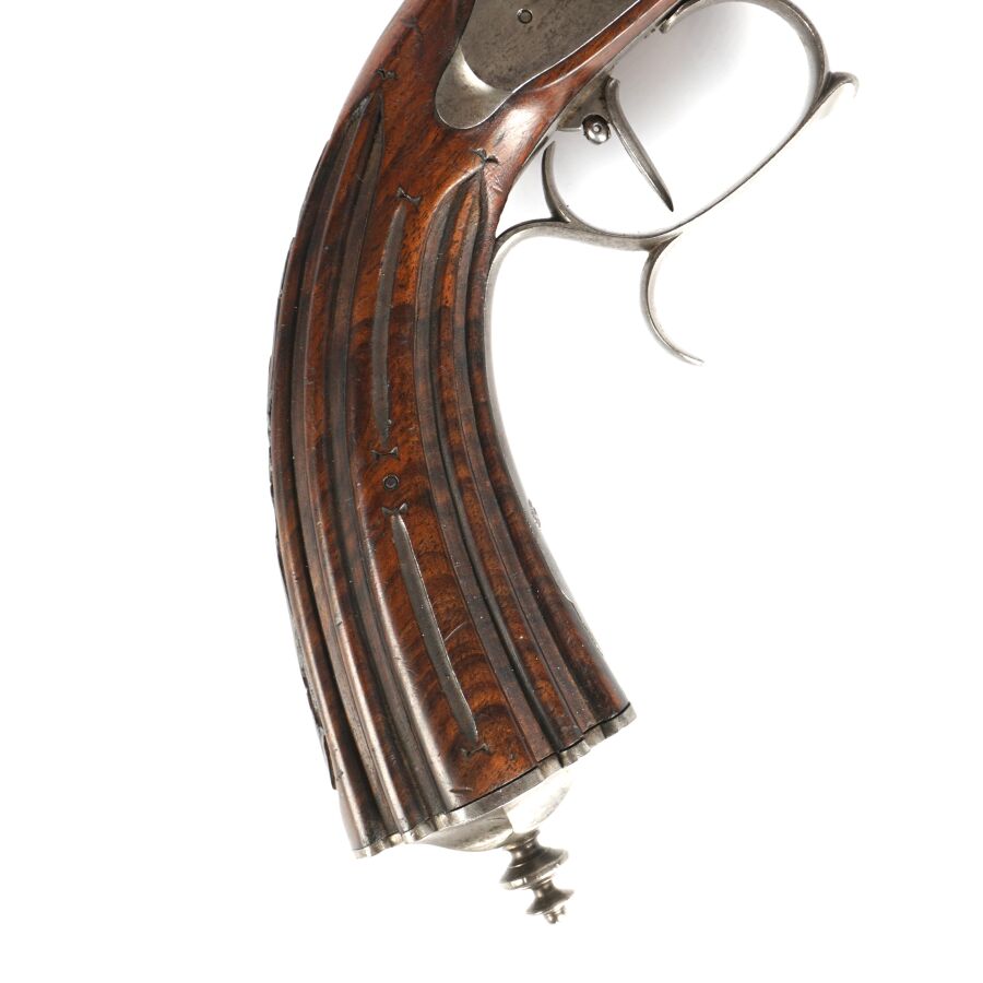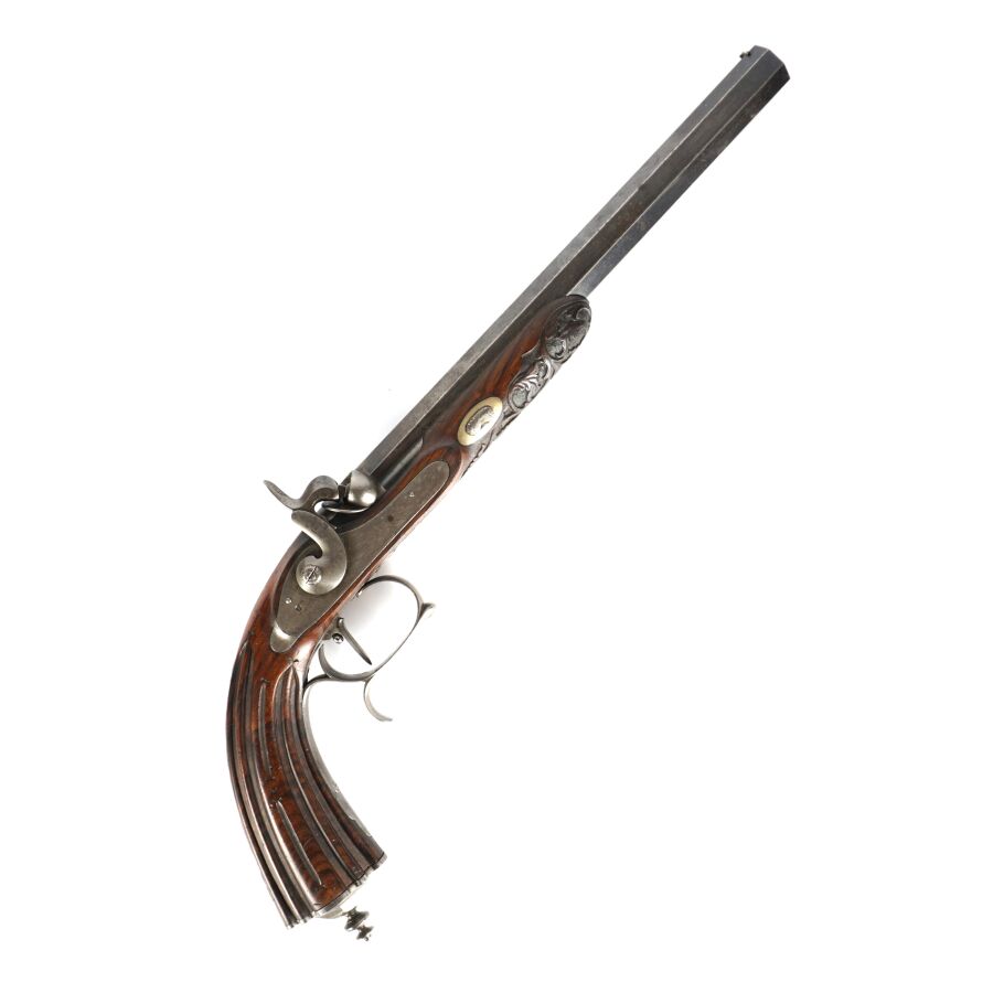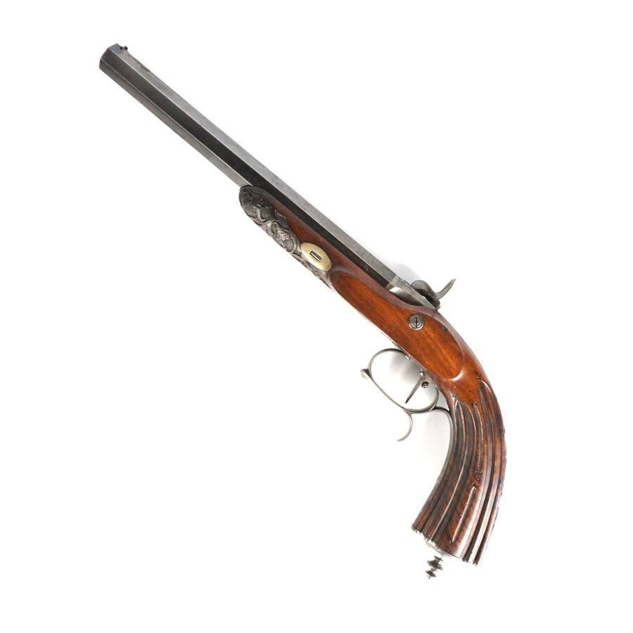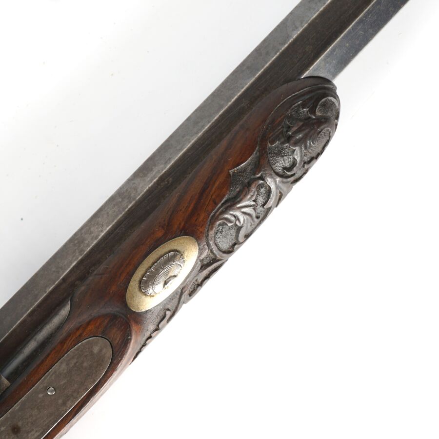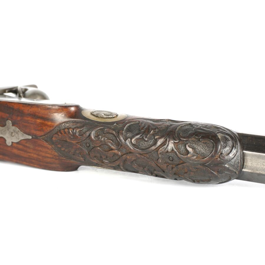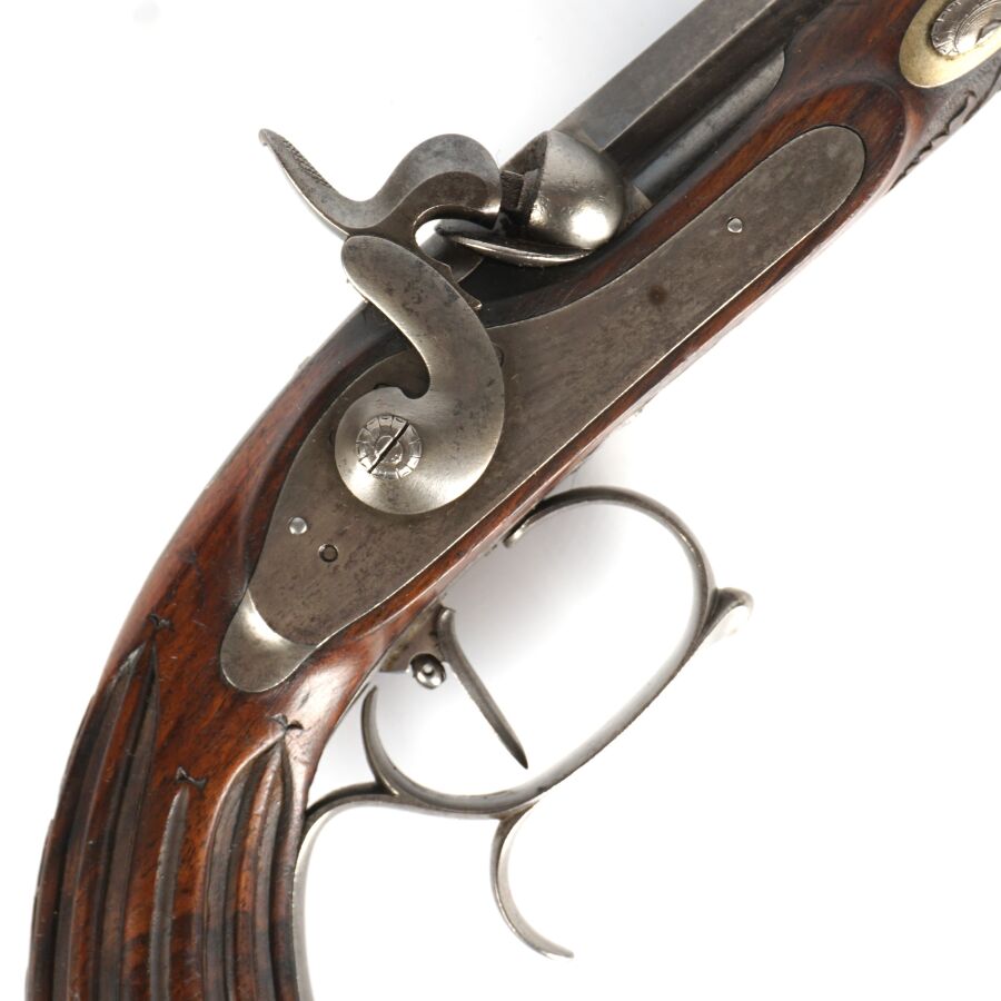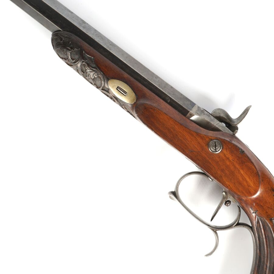 PAIRE DE PISTOLETS A PERCUSSION, platines à percussion, platines à corps plats et chiens à corps ronds, canons à pans marqués " DUSSAIGNE A SAINTES ", garnitures en fer, pontets avec repose-doigt, montures en noyer sculpté, mécanismes à revoir, longueur : 41 cm ;