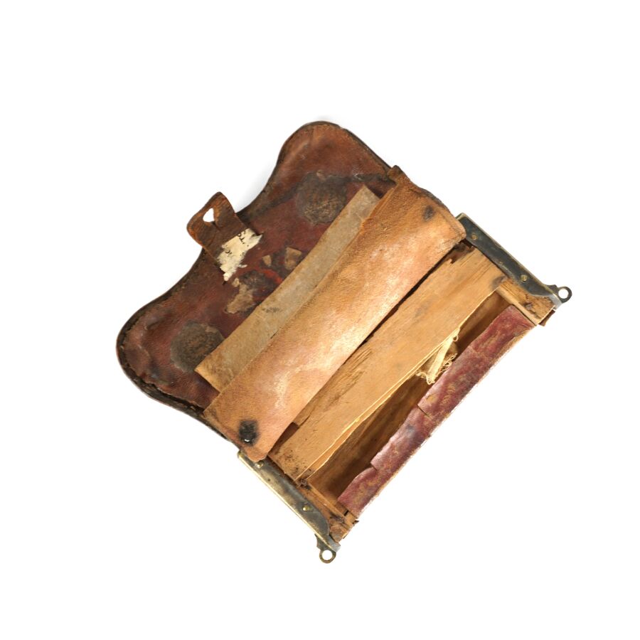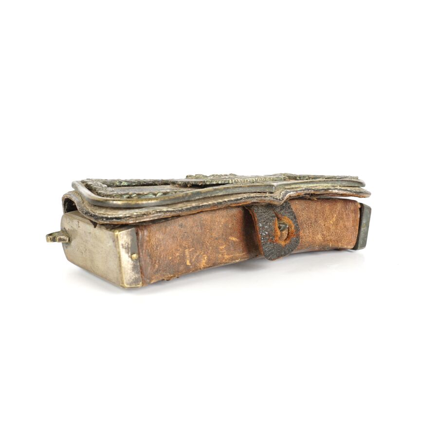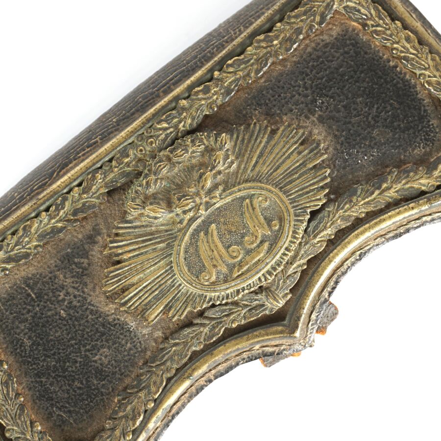 COFFRET DE GIBERNE DE PETITE TENUE en bois gainé de cuir noir et de laiton sur les côtés, patelette à décor d'un monogramme " MN " sur un fond rayonnant bordé d'un entourage de feuilles de chêne, 9 x 17 cm, accidents et manques, ABE.