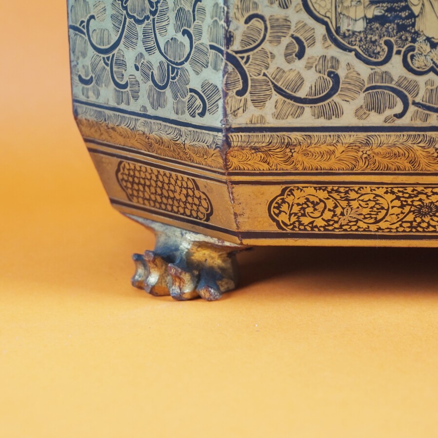 Coffret, laque or sur fond noir, à décor de scènes de personnages se déroulant à l'intérieur de jardins, motif de fleurs et rinceaux stylisés, ouvrant sur deux flacons en étain ciselé, Canton, Chine, début 20ème, circa 1880, H. 14.5 cm x L. 20 cm (petit éclat, sans clé).