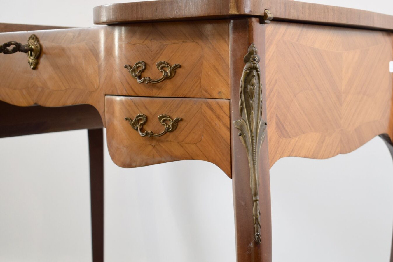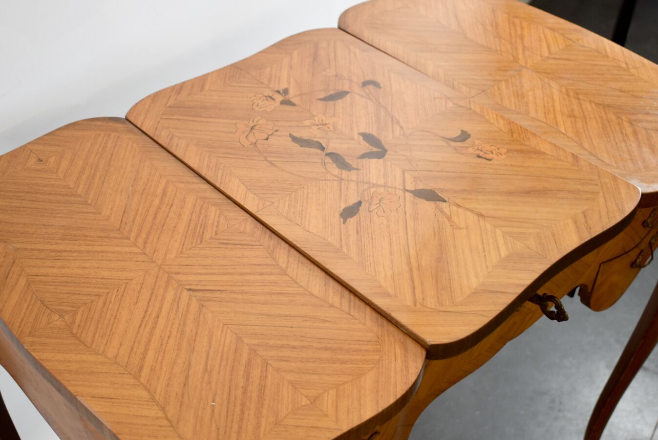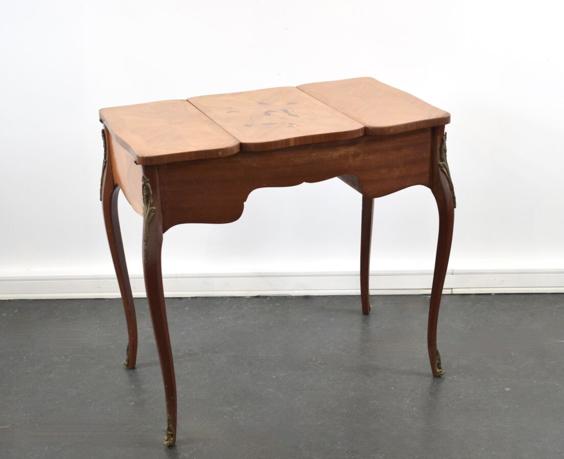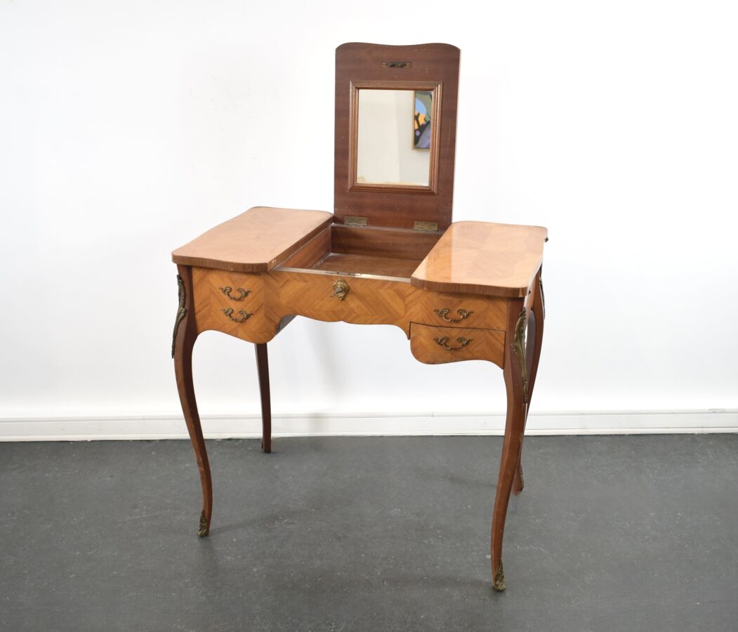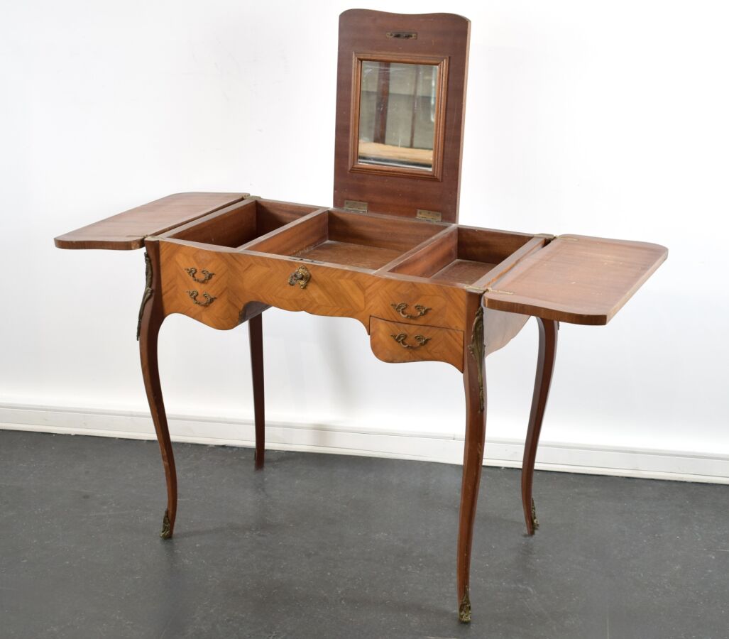 Coiffeuse à abattant de style Louis XV, placage à décor en frisage, ouvrant sur un miroir, pietement galbé, 75 x 80 x 47 cm (éclat au placage, usures)