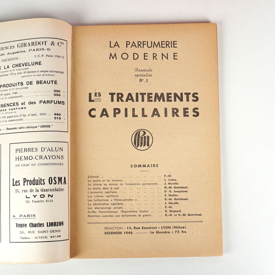 [COIFFURE]. La Parfumerie moderne. Fascicule spécialisé n°1. Les Traitements capillaires. Lyon, Derain, 1946. In-8 broché, couv. imprimée.