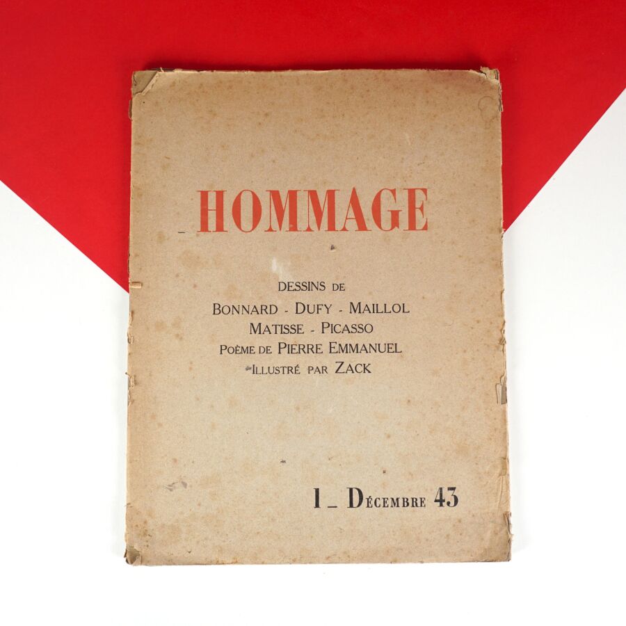 Collectif. Hommage. Dessins de BONNARD, DUFY, MAILLOL, MATISSE, PICASSO. Poème de Pierre EMMANUEL. Illustré par ZACK. 1_Décembre 43. Monaco, sn, 1943. In-folio en ff., couv. imprimée rempliée (usagée et piquée). Feuillet de justification piqué.