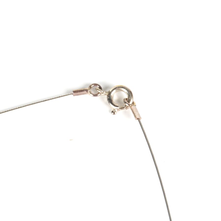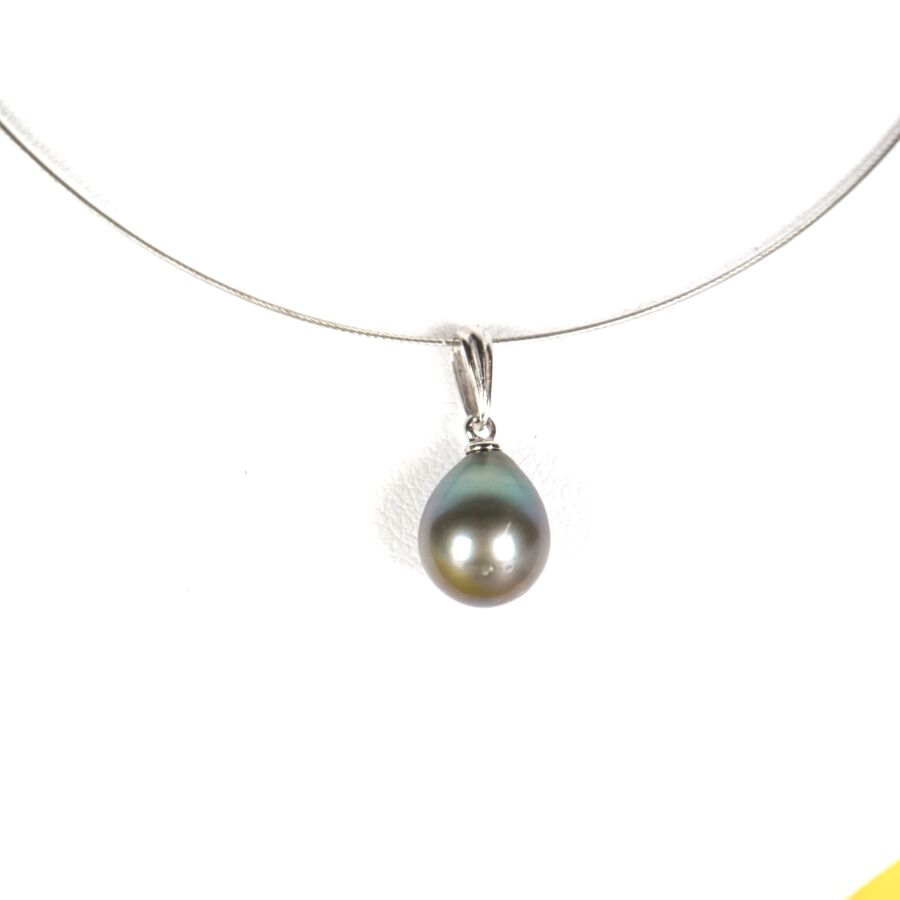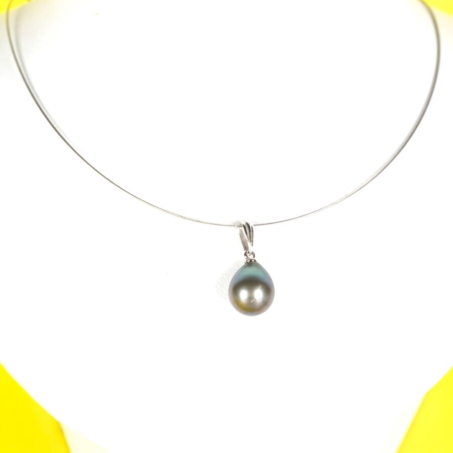 Collier câble, retenant en pendentif une perle de Tahiti (D. 8/9 mm), monture en or gris 18K (750/oo), fermoir à anneau ressort, L. 43 cm environ. Poids brut : 1.7 g environ.
