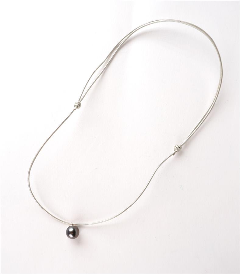 Collier cordon coulissant en cuir argenté retenant une perle de Tahiti, 8/9 mm.
