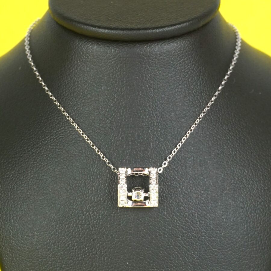 Collier "Coulisseau" en or gris 18K (750/oo), chaîne maille forçat, pendentif carré serti au centre d'un diamant blanc mobile de taille moderne, calibrant 0.10 ct environ et agrémenté de 14 petits diamants blancs taille moderne calibrant ensemble 0.10 ct environ, L. 40 cm. Dim. Pendentif : 10 x 10 mm. Poids brut : 2 g environ.