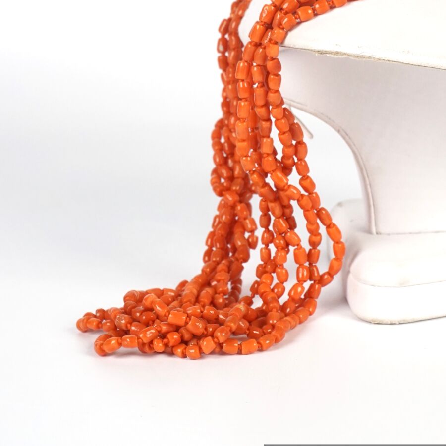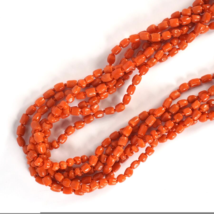 Collier de 6 rangs de perles de corail, agrémenté d'un motif incurvé et godronné en or de 2 tons 18K (750/oo), serti d'un profil d'homme traité en camée, et recevant le fermoir à cliquet, L. 50 cm. Poids brut : 78 g environ.