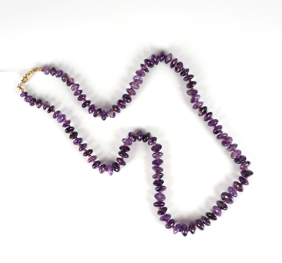 Collier de perles aplaties d'améthyste, en chute, L. 71 cm.