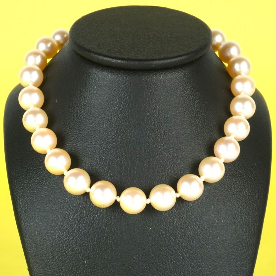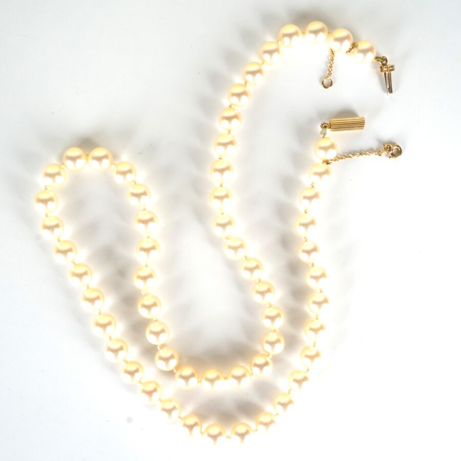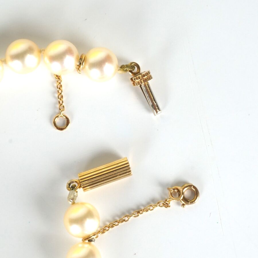 Collier de perles blanches (D. 7/8 mm), fermoir cylindrique à cliquet en or jaune 18K (750/oo) avec sa chaîne de sécurité, L. 48.5 cm. Poids brut : 32.3 g environ (petites usures aux perles).