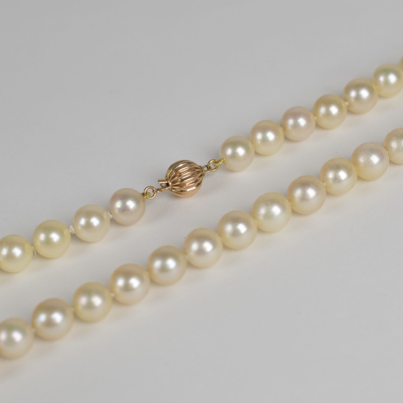 Collier de perles blanches (D. 8/9 mm), fermoir à crochet de forme sphérique rainuré en or jaune 18K (750/oo), L. 43.5 cm. Poids brut : 38.6 g environ (usures).