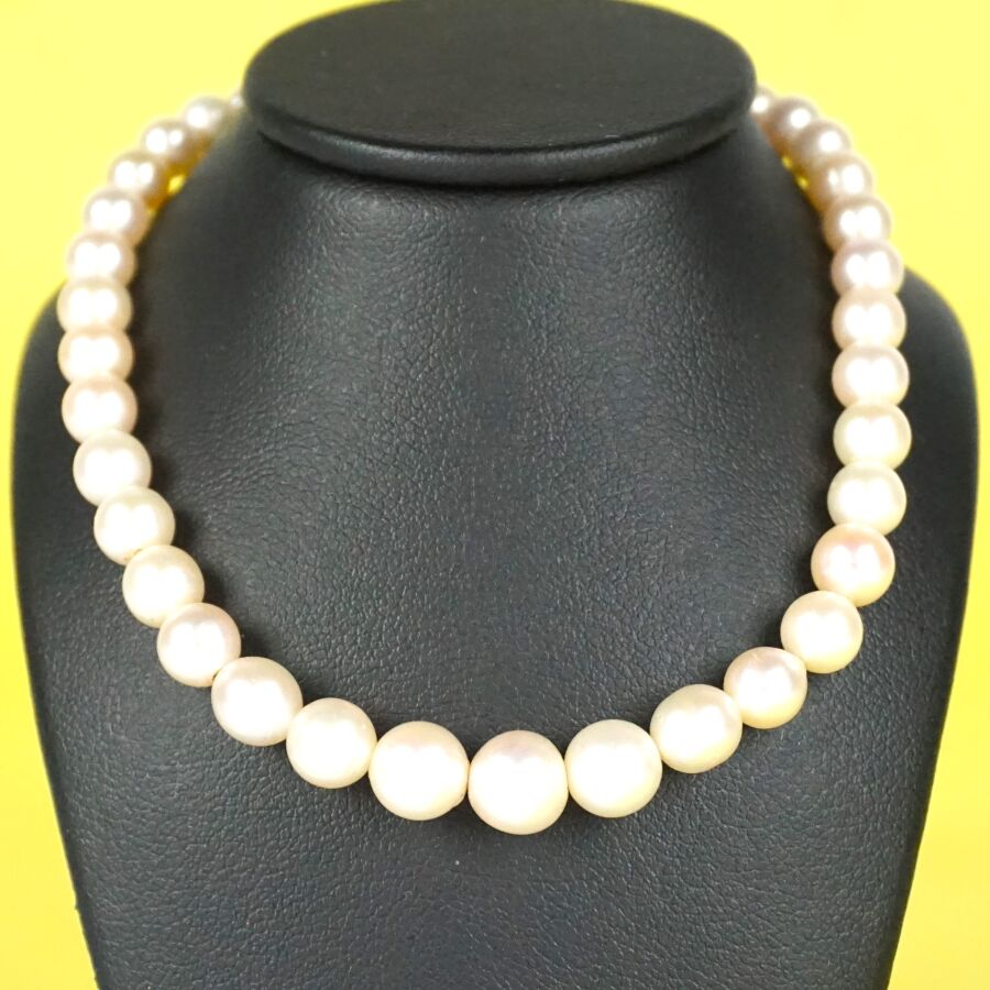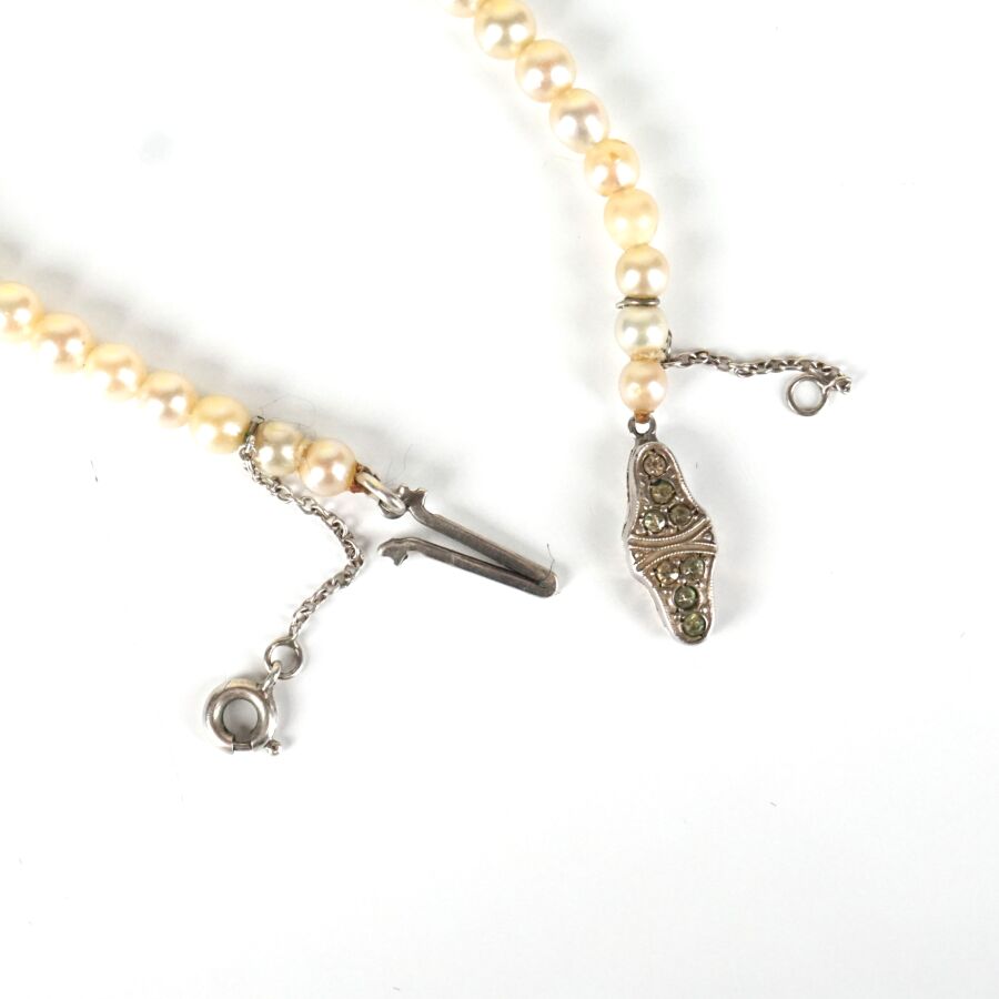 Collier de perles blanches disposées en chute (D. 3.5 mm à 8 mm), fermoir à cliquet en argent (800/oo) serti de petites verroteries teintées vertes et chaîne de sécurité, fermoir à anneau ressort, L.40 cm. Poids brut : 19.7 g environ.