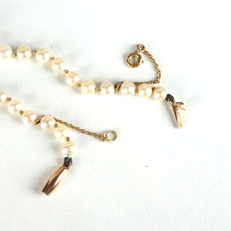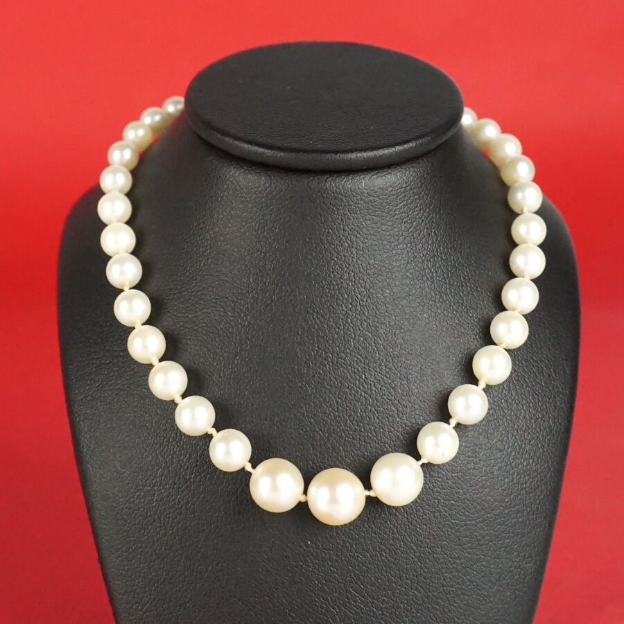 Collier de perles blanches disposées en chute (D. de 3.5 mm à 8 mm), fermoir à cliquet de forme cylindrique avec sa chaîne de sécurité, L. 50 cm. Poids brut :14,4 g environ.