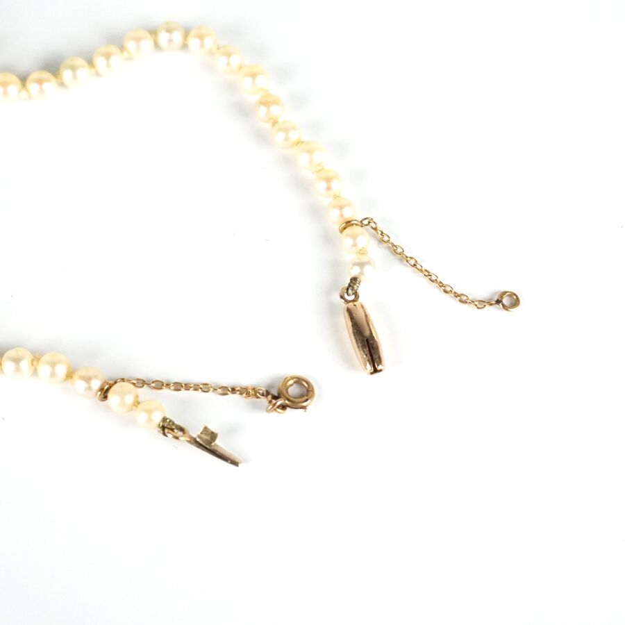 Collier de perles blanches disposées en chute (D. de 3.5 mm à 8 mm), fermoir à cliquet de forme cylindrique en or jaune 18K (750/oo) et sa chaîne de sécurité à fermoir à anneau ressort, L. 59 cm. Poids brut :15.9 g environ.