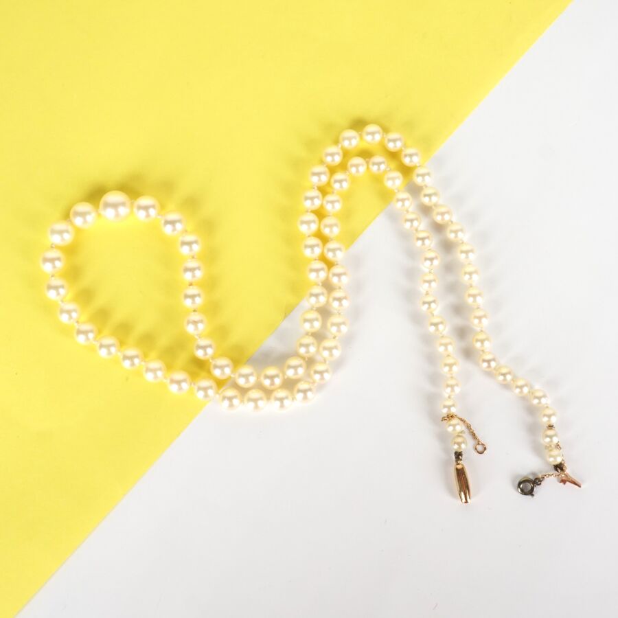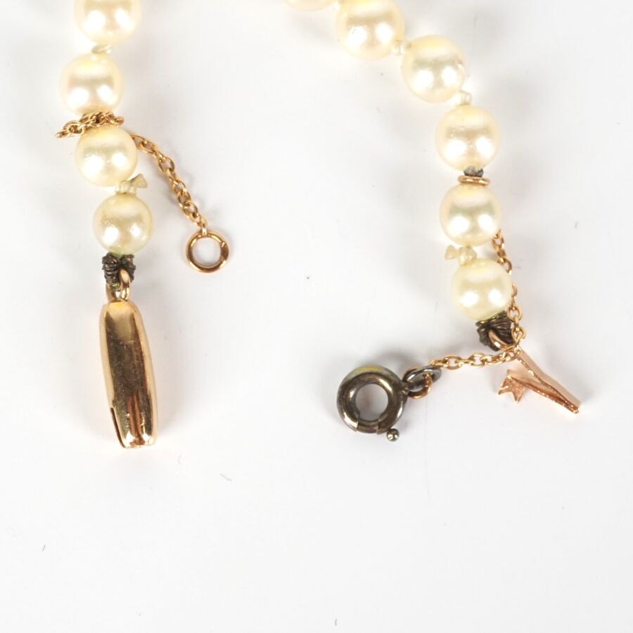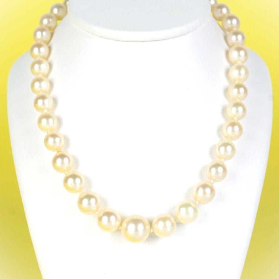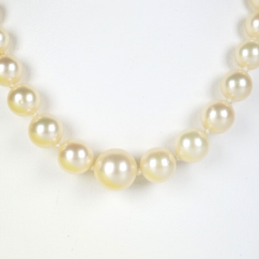 Collier de perles blanches disposés en chute (D. 4 à 8 mm), fermoir à cliquet en or jaune 18K (750/oo), avec sa chaîne de sécurité, L. 51 cm. Poids brut : 19.3 g environ (anneau ressort rapporté en métal).