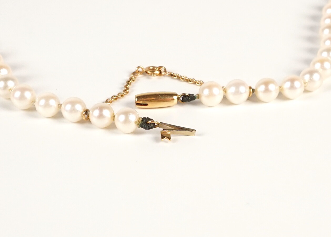 Collier de perles de culture 5 mm, fermoir à cliquet en or jaune 18K (750/oo), L. 43 cm (bel état et belle couleur des perles).