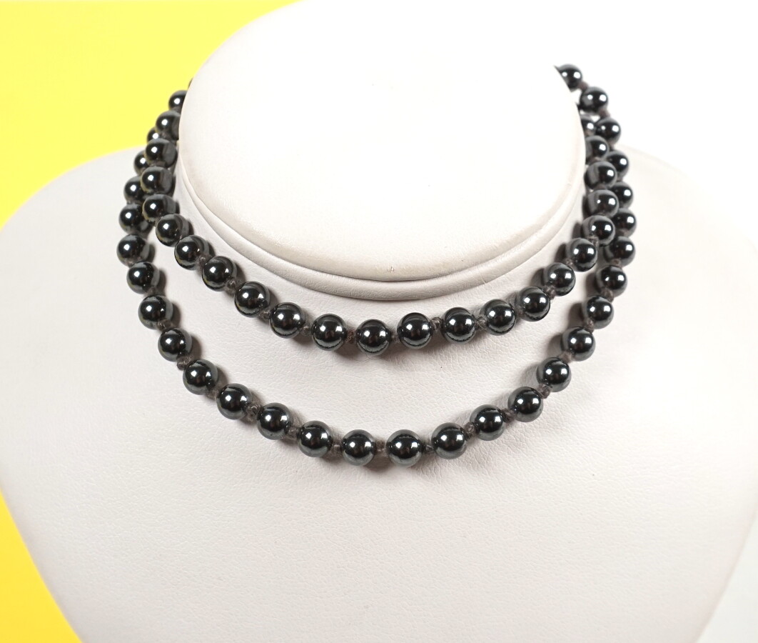Collier de perles de pierres dures grises, probablement des perles d'hématite, D. 5 mm, fermoir et chaine de sûreté en or jaune 18K (750/oo), L. 46 cm. Poids brut : 26 g environ.