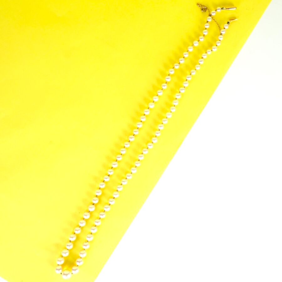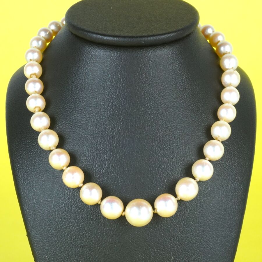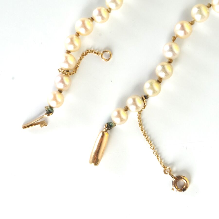 Collier de perles disposées en chute (D. de 8 mm à 4.5 mm), fermoir cylindrique à cliquet en or jaune 18K (750/oo) avec chaîne de sécurité à anneau ressort, L. 52 cm. Poids brut : 18.8 g environ (petites usures).