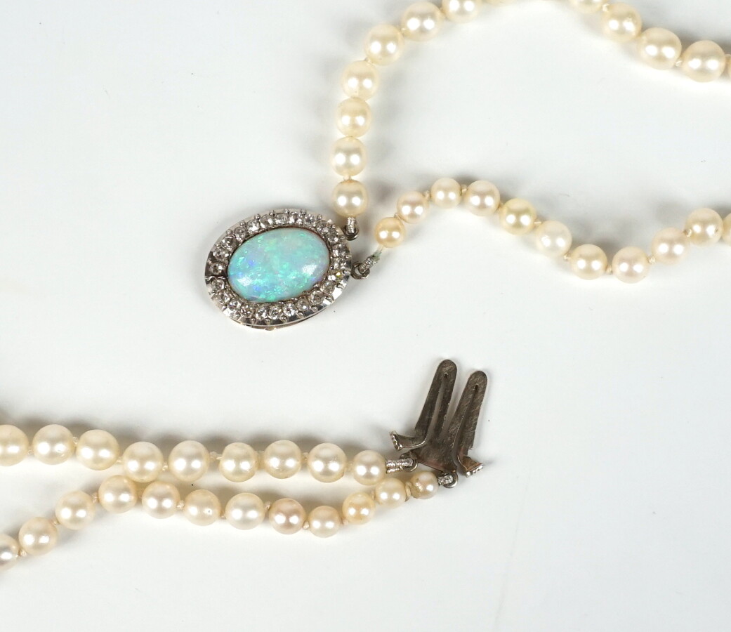 Collier "Deux rangs" de perles de culture disposées en chute, de 3 mm à 8 mm de diamètre, fermoir à cliquet en or gris 18K (750/oo) serti au centre d'une opale cabochon ovale (12 x 8 mm) dans un entourage de petits diamants ronds taille ancienne, L. 60 cm environ. Poids brut : 50.5 g environ.
