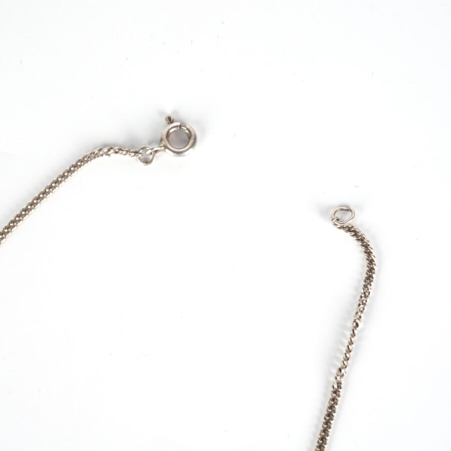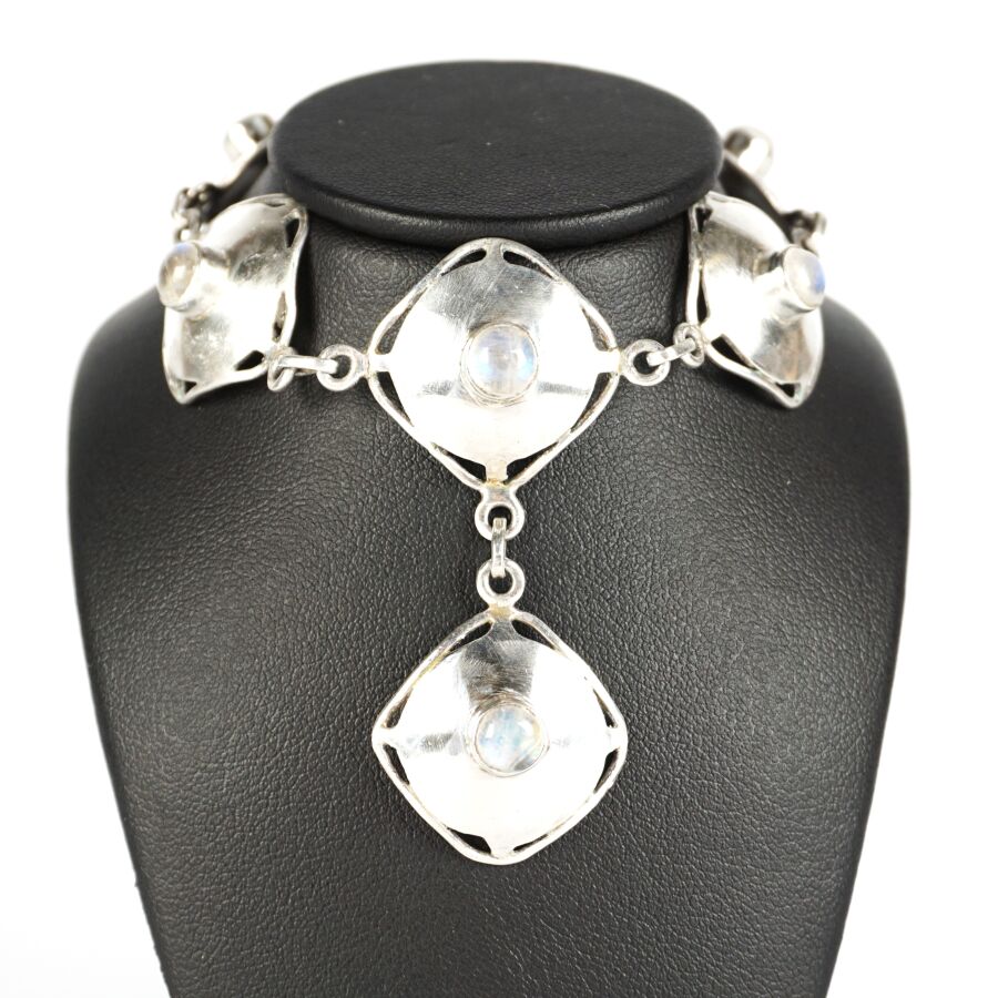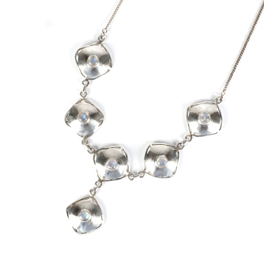 Collier en argent (925/oo), chaîne maille forçat retenant en pendentif type plastron 6 pastilles osangés sertie chacune d'une pierre de lune taille cabochon (D. 5.2 mm), fermoir à anneau ressort, L. 42 cm. Dim. Pastlle : 2.3 x 2.3 cm. Poids brut : 22.5 g environ.