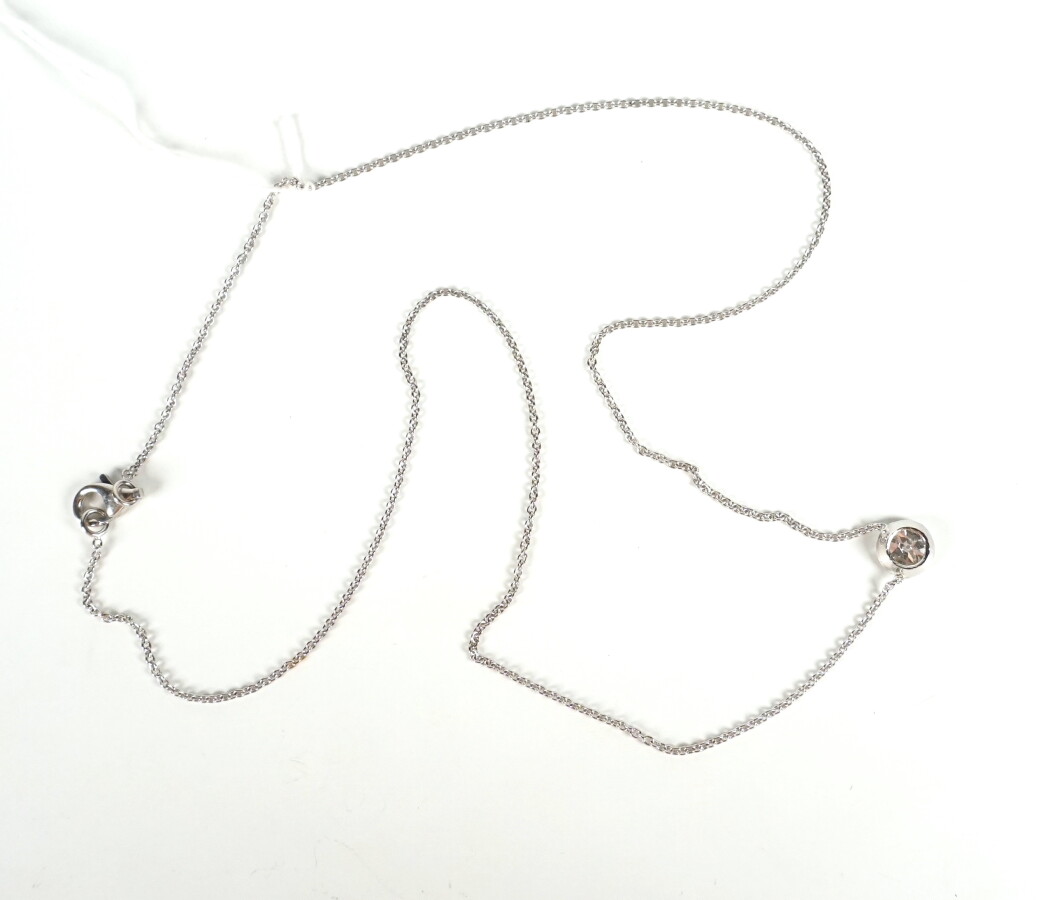 Collier en or blanc 18K (750/oo) la chaine maille forçat ronde retenant au centre un diamant taille ancienne serti clos calibrant 0.7 ct environ, L. 42 cm. Poids brut : 2.9 g environ.