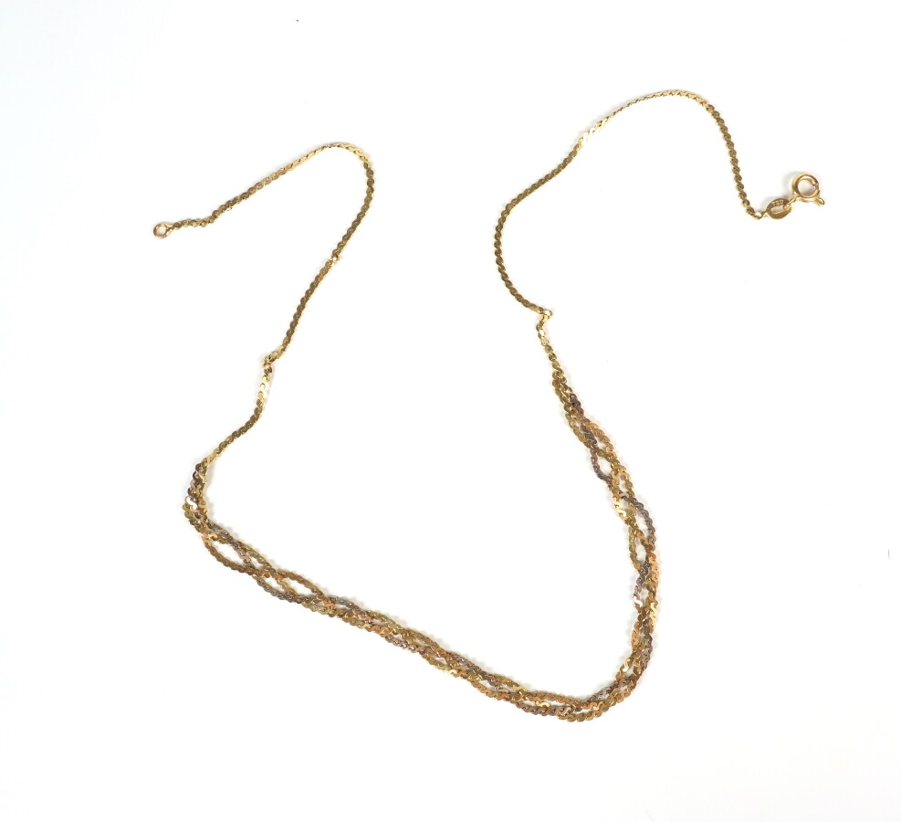 Collier en or de 3 tons 18K (750/oo), maille "vaguelettes" plate, formant au centre un motif de 3 rangs entremêlés, L. 41 cm. Poids brut : 6.4 g environ.