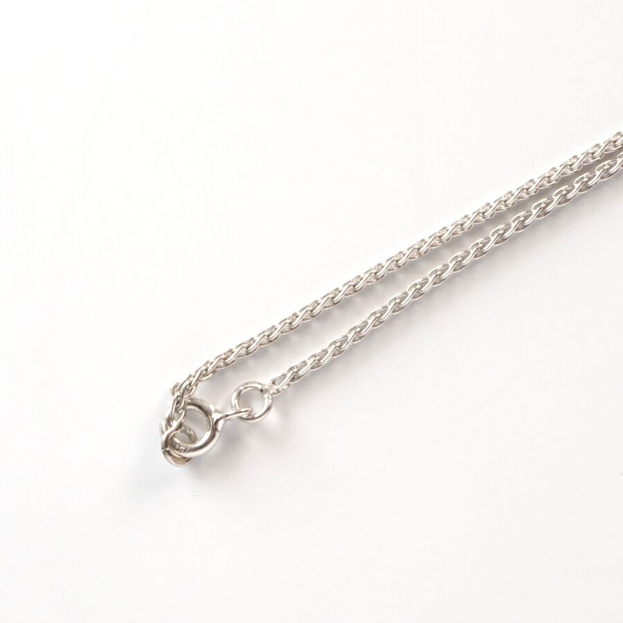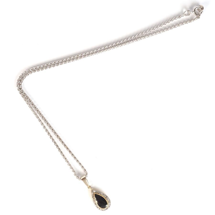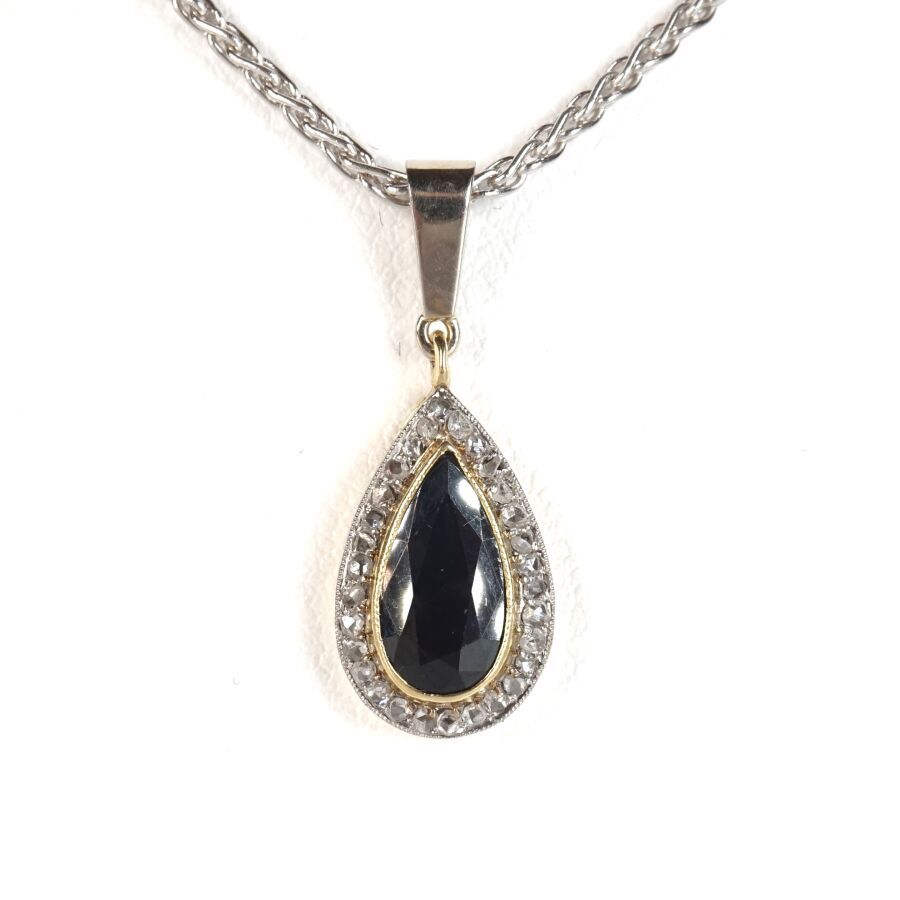 Collier en or gris 18K (750/oo), maille torsadée, retenant un pendentif de forme goutte serti d'une pierre bleue, probablement un saphir, calibrant 0.75 ct environ (1x0.5 cm), dans un entourage de petits diamants taille rose, fermoir à anneau ressort, H. Pendentif : 2.9 cm. L. 35.5 cm. Poids brut : 5.3 g environ.