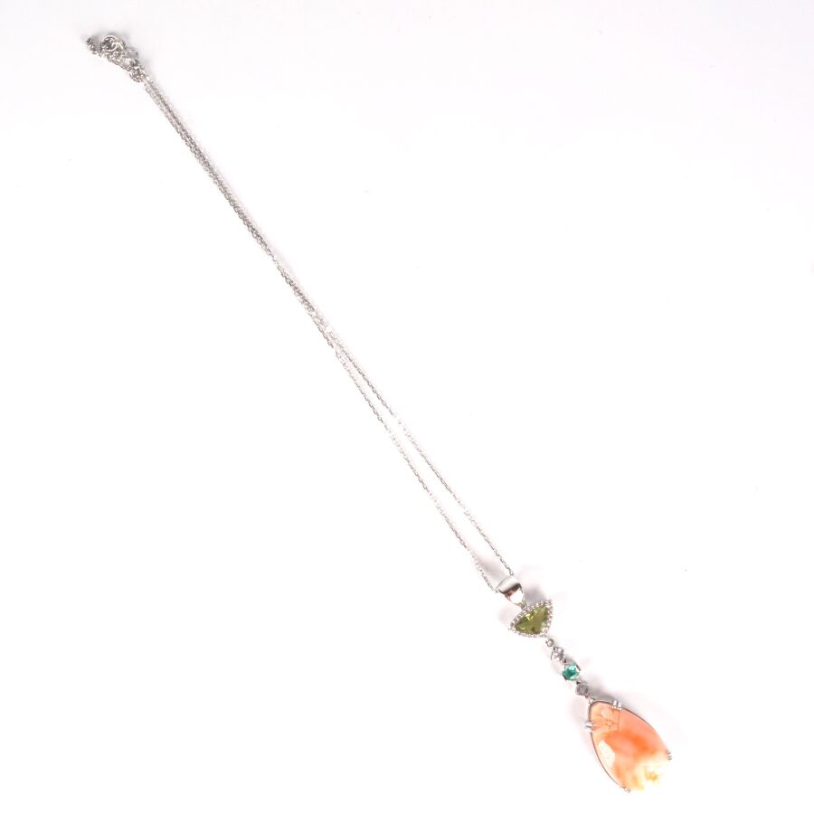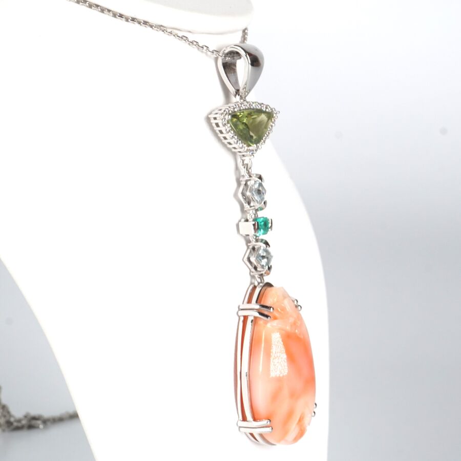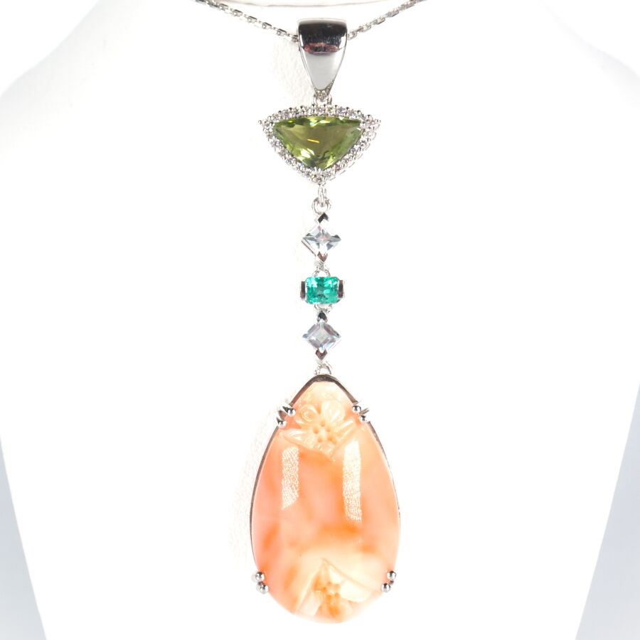 Collier en or gris 9K (375/oo), chaîne maille forçat retenant un pendentif en or gris 14K (575/oo) retenant un péridot triangulaire (Dim. 6 x 9 mm) bordé de 25 petits diamants taille brillant, surmontant deux aigues-marines taille radiant et une émeraude taille émeraude et terminant par un corail (teinté) de forme goutte et taille cabochon, sculpté de motifs floraux, fermoir à anneau ressort, L. 40 cm. H. Pendentif : 6 cm. Poids brut : 8.4 g environ.