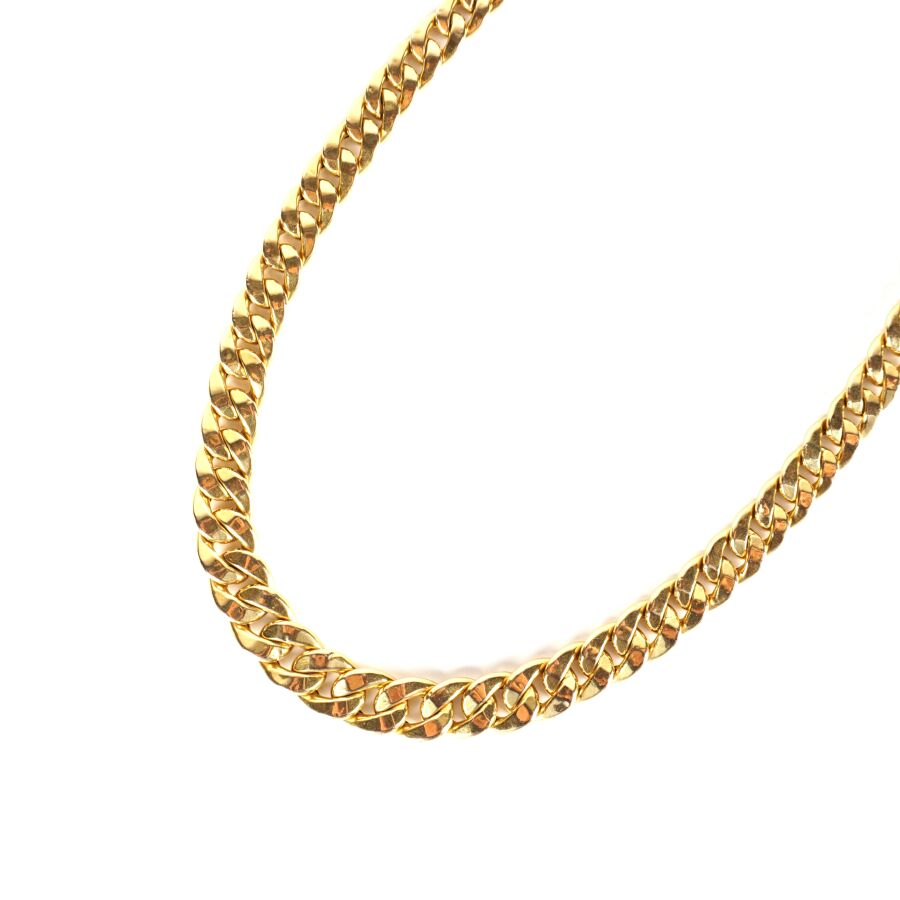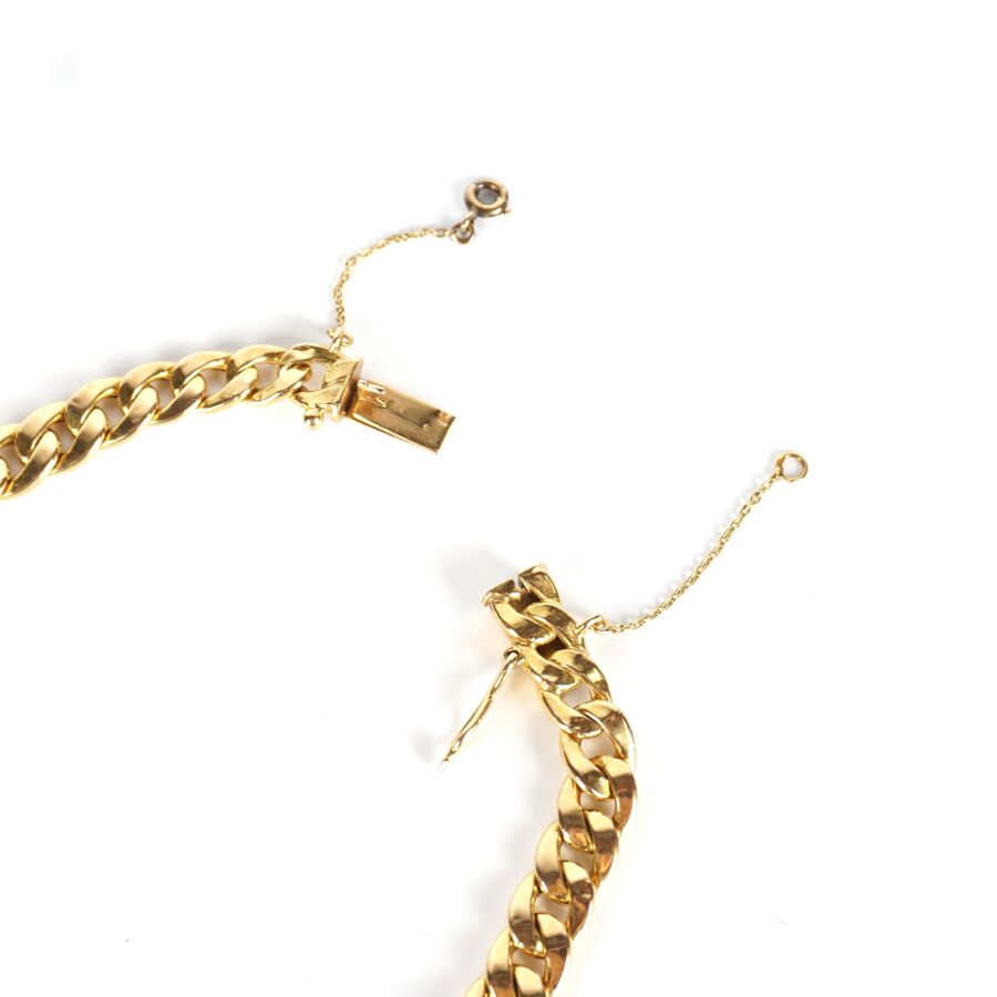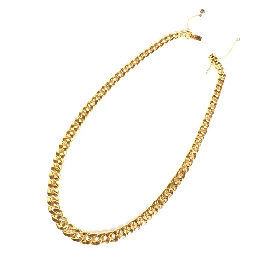 Collier en or jaune 18K (750/oo) à maille gourmette en chute, fermoir à cliquet avec chaîne de sécurité à fermoir à anneau ressort et 8 de sécurité, L. 41 cm. Larg. De 6 mm à 1 cm). Poids brut : 20.2 g environ.