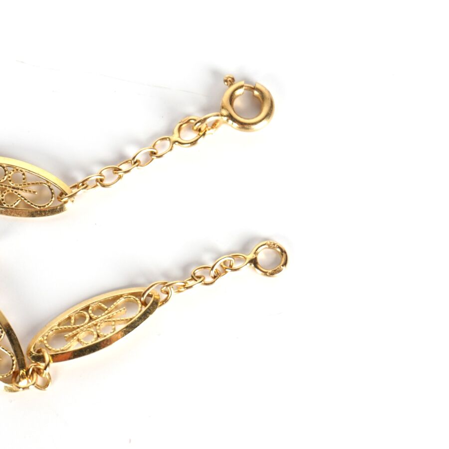 Collier en or jaune 18K (750/oo) à motif de pastilles de forme ovales à décor filigrané et ajouré d'entrelacs, fermoir à anneau ressort, L. 60.5 cm. Larg. 5 mm. Poids brut : 12.3 g environ.