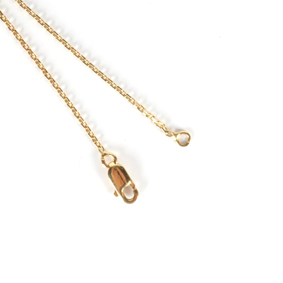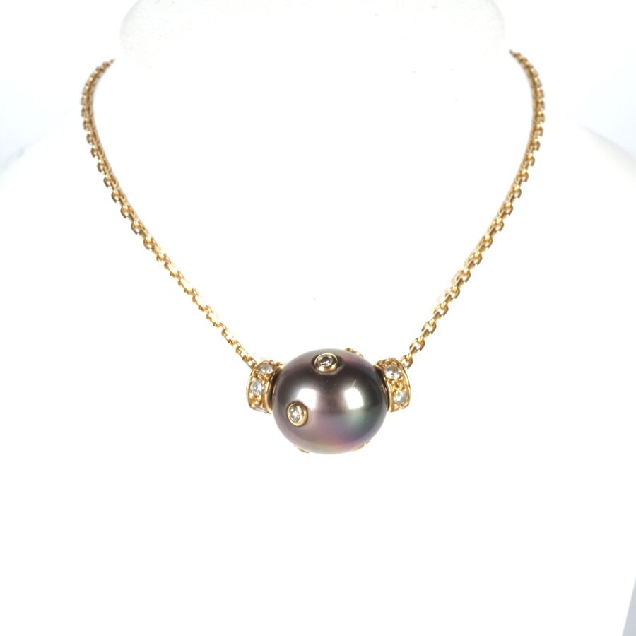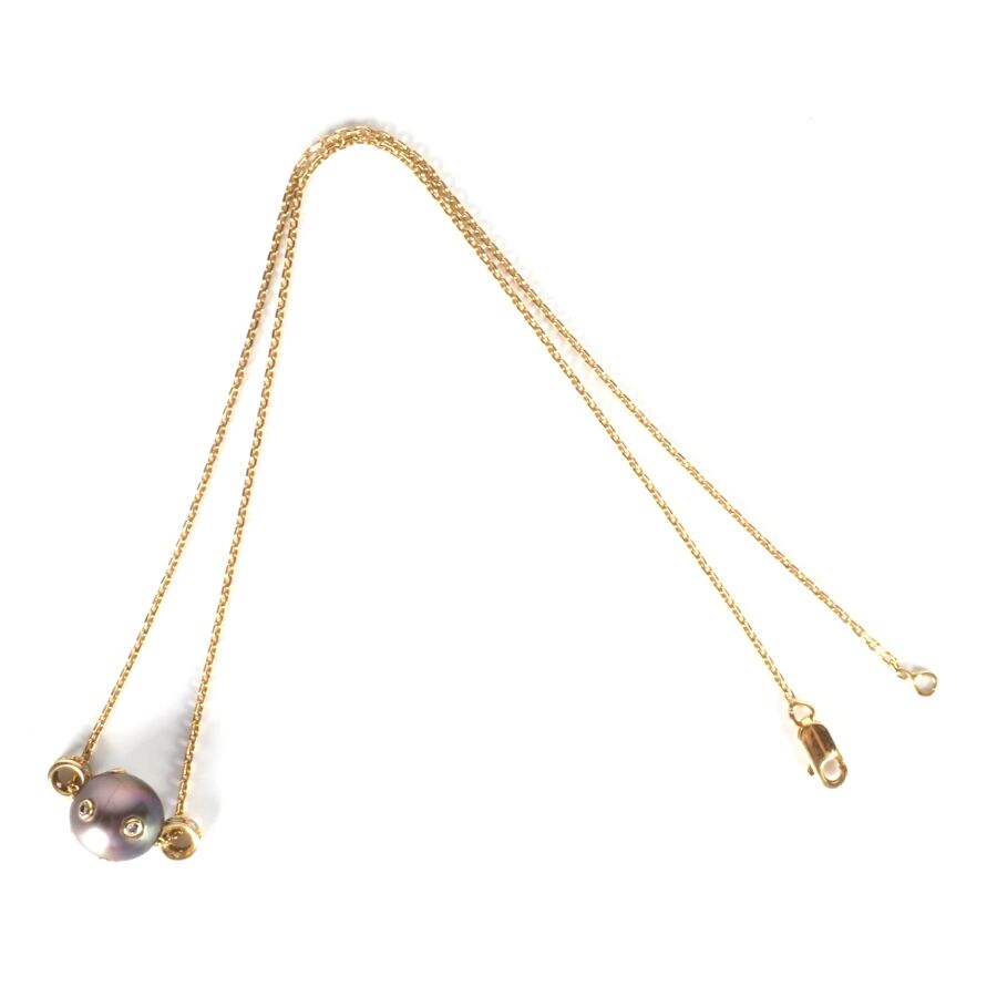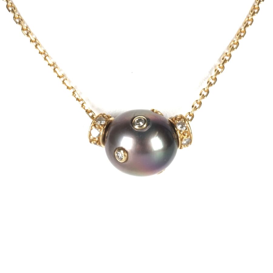 Collier en or jaune 18K (750/oo), chaîne maille forçat, retenant en pendentif coulisseau une perle de Tahiti (D. 1/1.1 cm) sertie de 8 petits diamants en serti clos (D. 1 mm), encadrée de deux bagues mobiles serties de 2x7 petits diamants, fermoir mousqueton, L. Totale : 40 cm. Poids brut : 6 g environ.