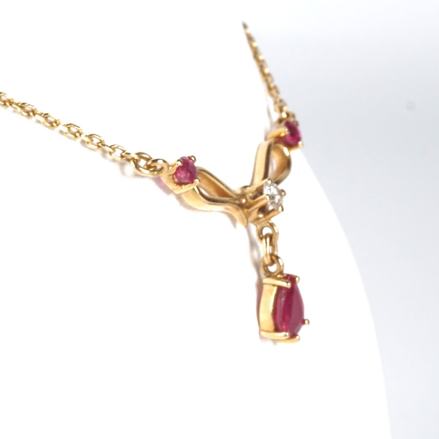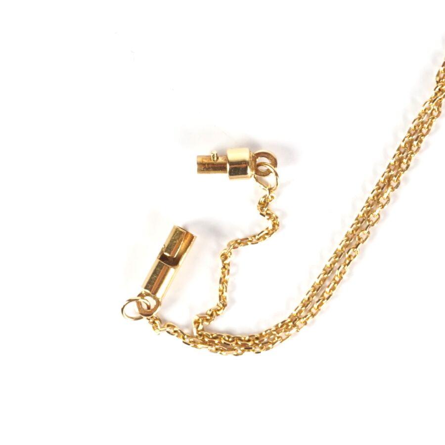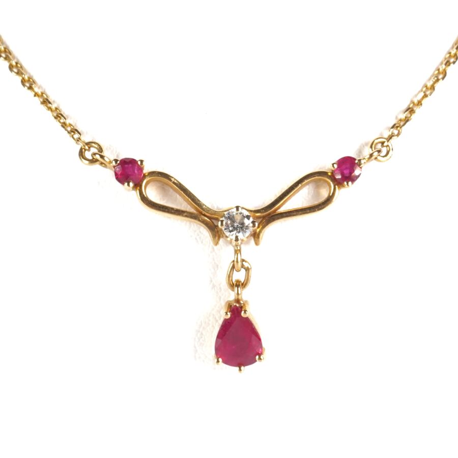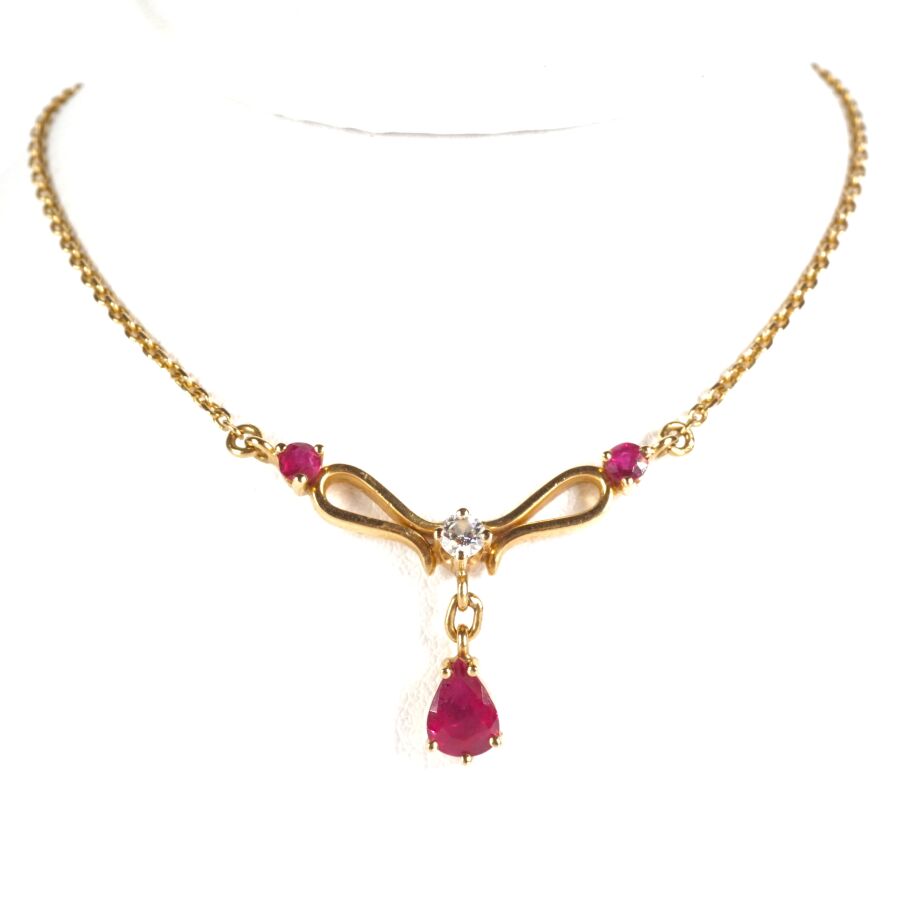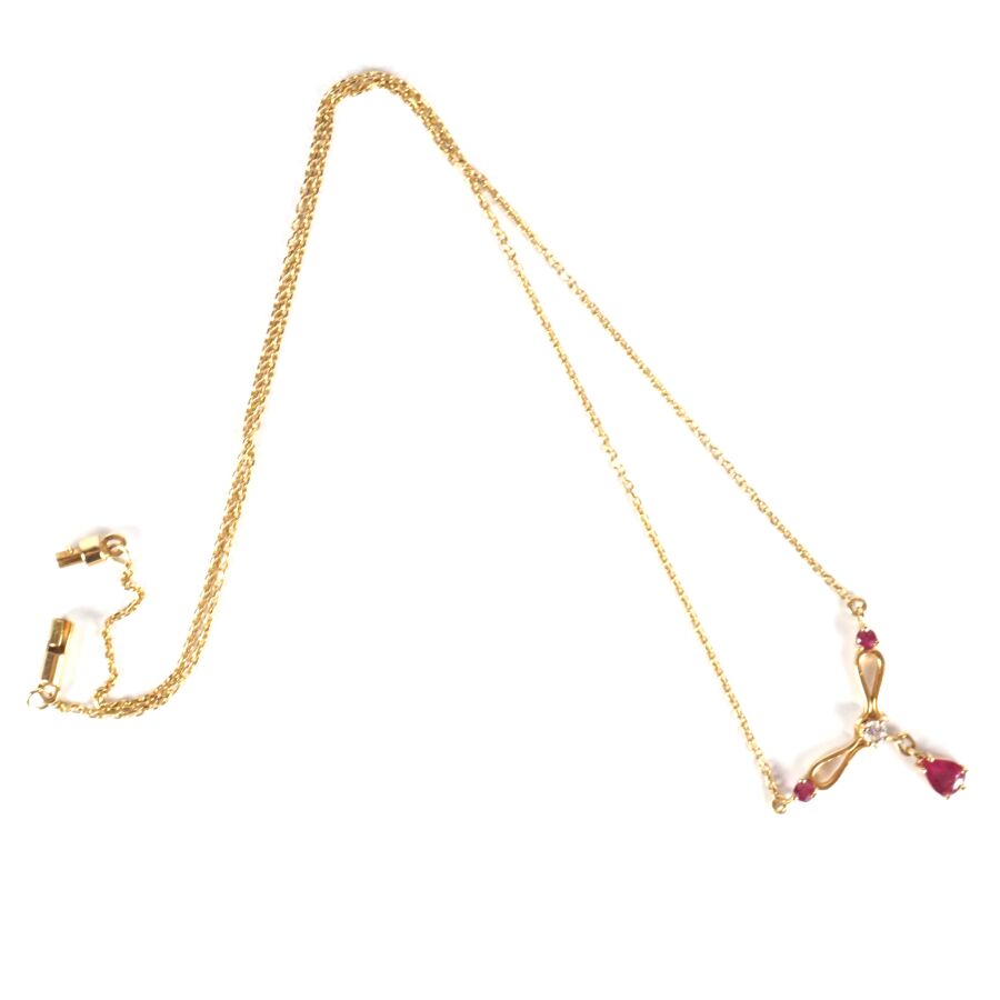 Collier en or jaune 18K (750/oo), chaîne maille forçat, retenant un pendentif "Trilogie" serti au centre d'un diamant rond calibrant 0.06 ct environ (D. 2.5 mm) et 3 pierres rouges, probablement des rubis, deux taille ronde (D. 2.5 mm) et une mobile de taille poire (D. 5.5 x 4 mm). fermoir cylindrique, L. 44 cm. Dim. Pendentif : 2.5 x 1.9 cm. Poids brut : 4.2 g environ.