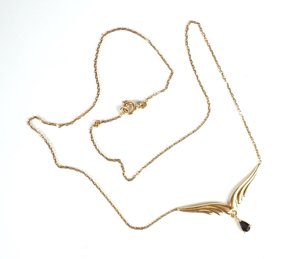 Collier en or jaune 18K (750/oo) composé d'une chaine maille forçat ornée d'un motif croisé godronné, retenant une goutte mobile sertie d'une pierre bleue taillée en poire, probablement un saphir, fermoir mousqueton, Dim. du motif : 3.6 x 2 cm, L. de la chaine : 42 cm. Poids brut : 2.8 g environ.