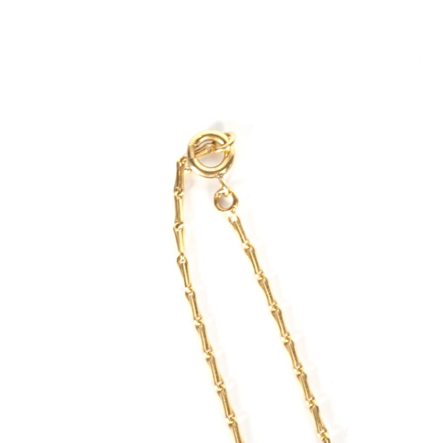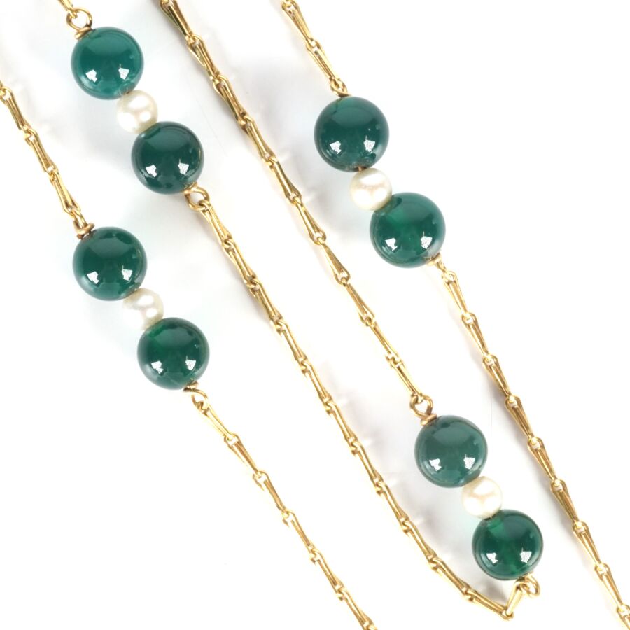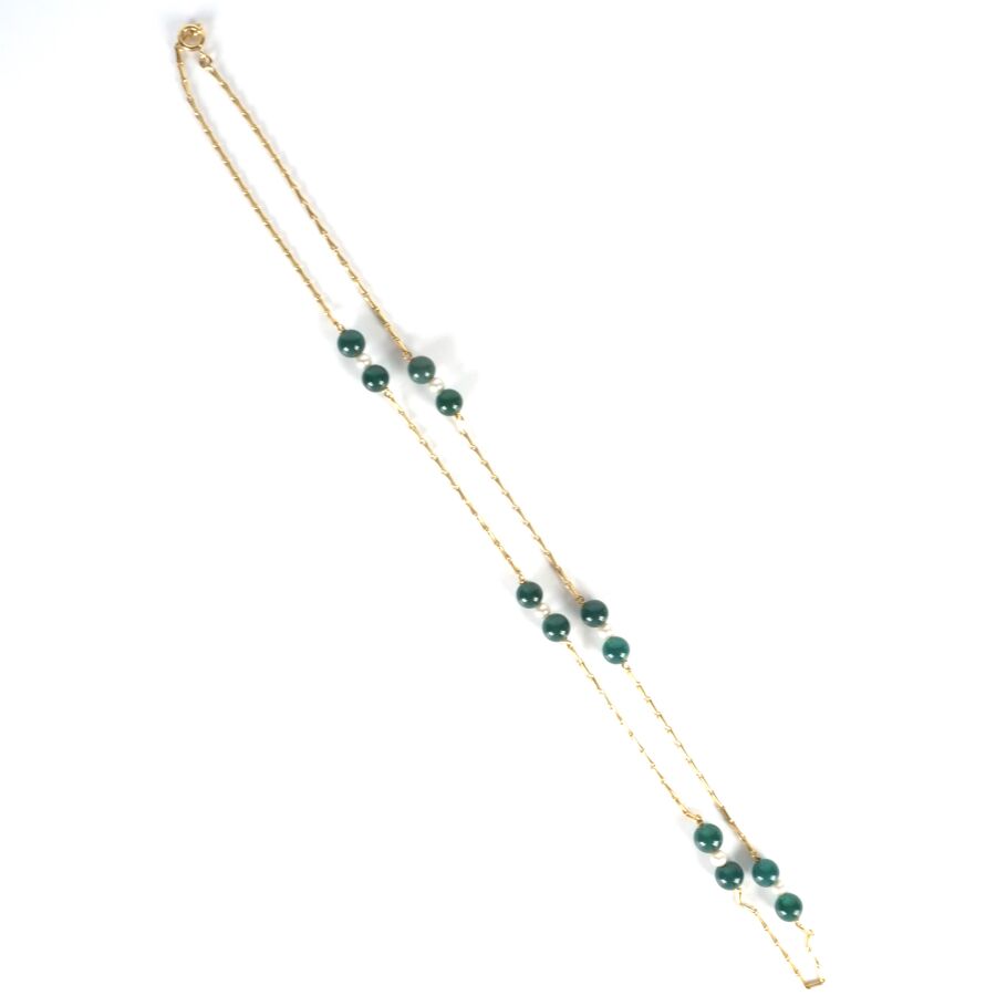 Collier en or jaune 18K (750/oo), maille allongée alternée de 6x2 perles de pierre dure verte (D. 7 mm), probablement de l'agate et de 6x1 perle blanche (D. 3 mm) , fermoir à anneau ressort, L. 58.5 cm. Poids brut : 12.1 g environ.