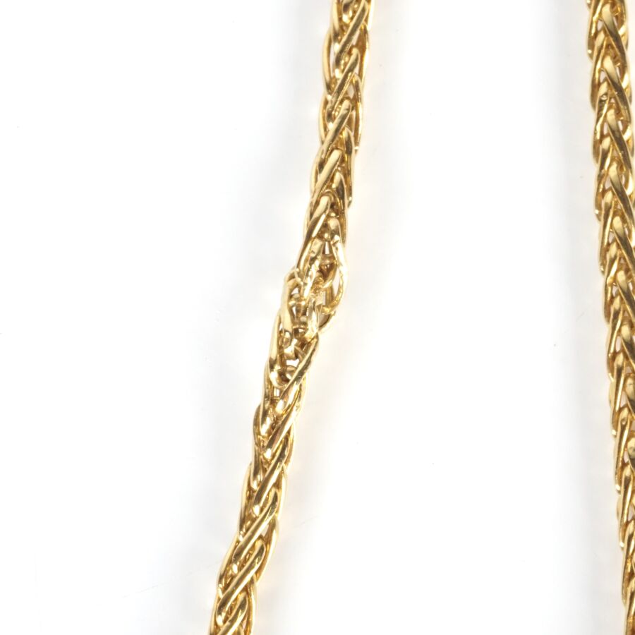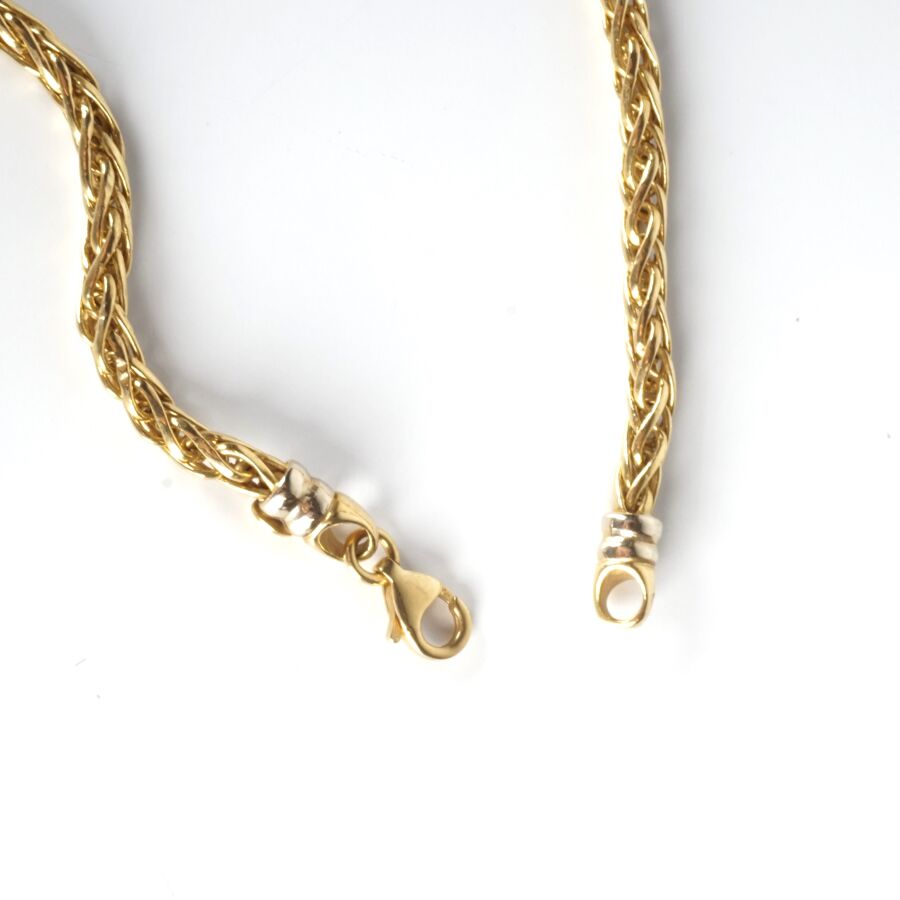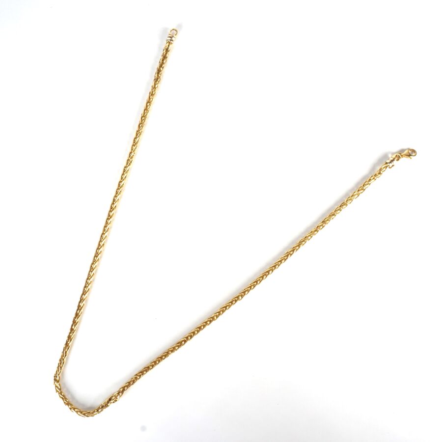 Collier en or jaune 18K (750/oo), maille palmier, fermoir mousqueton, L. 44.5 cm Larg. 3 mm. Poids brut : 10.2 g environ (accroc à un maillon).