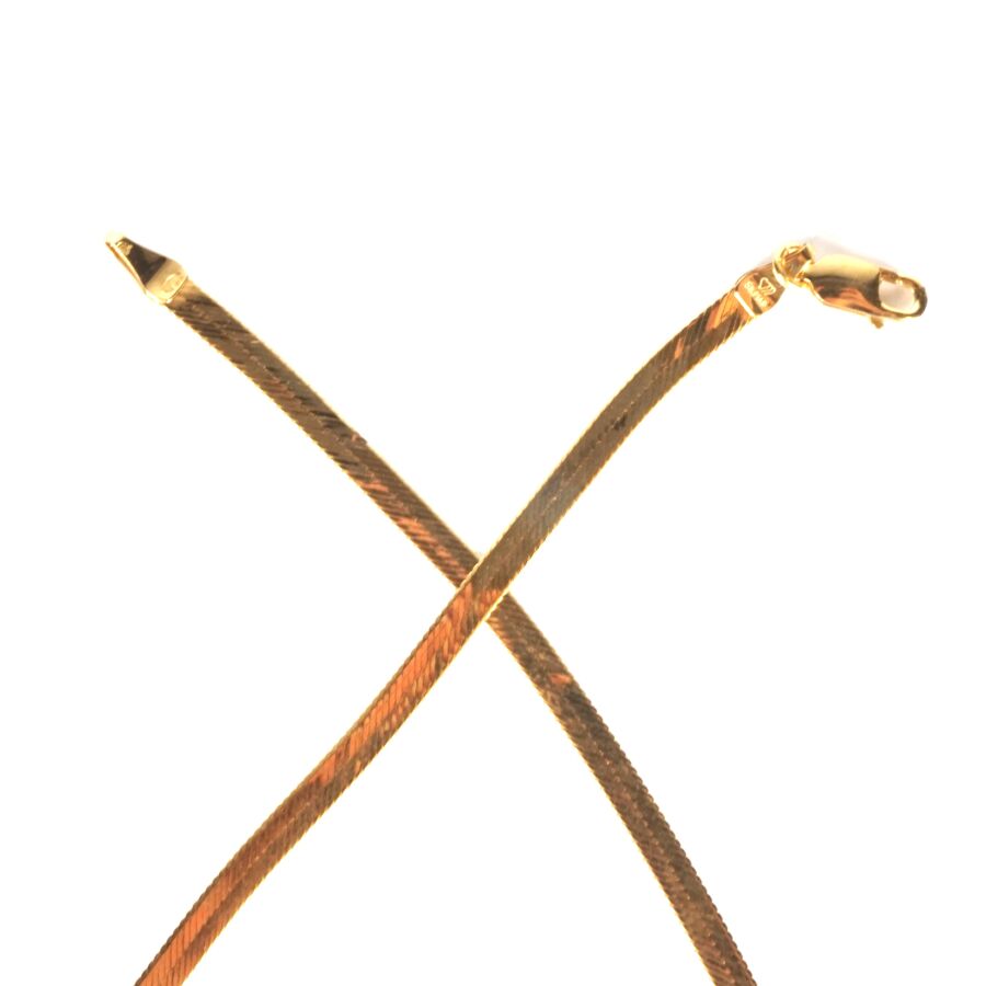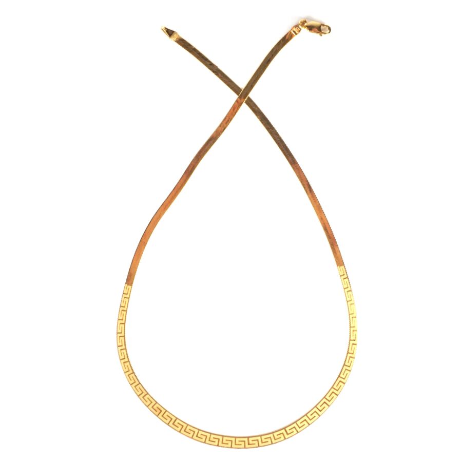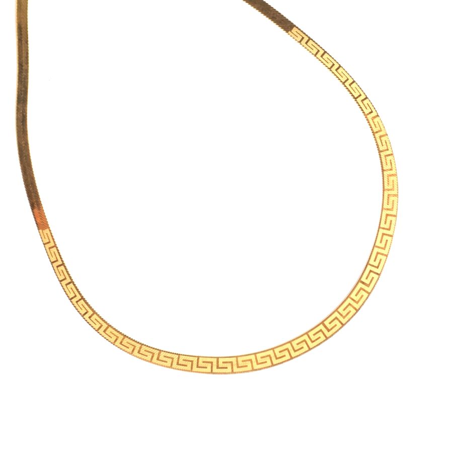 Collier en or jaune 18K (750/oo), maille plate dite miroir à motif sur une face d'une frise de poste, fermoir mousqueton, L. 41.9 cm. Larg. 3 mm. Poids brut : 5.3 g environ.