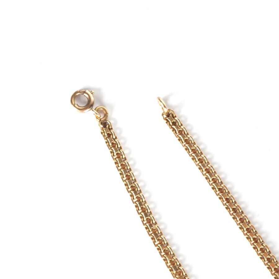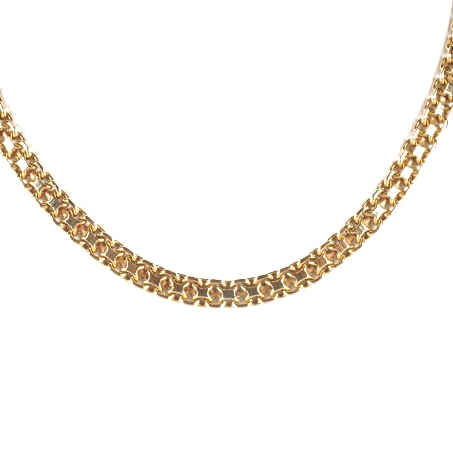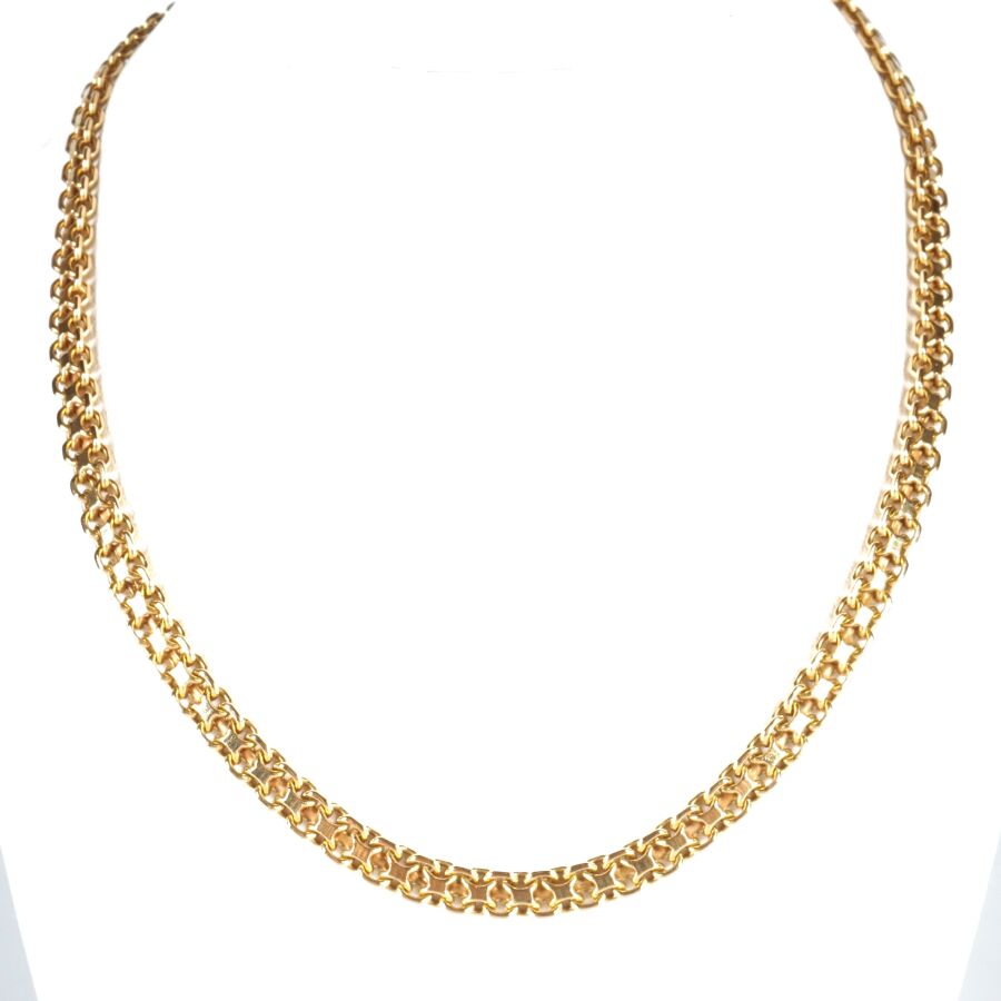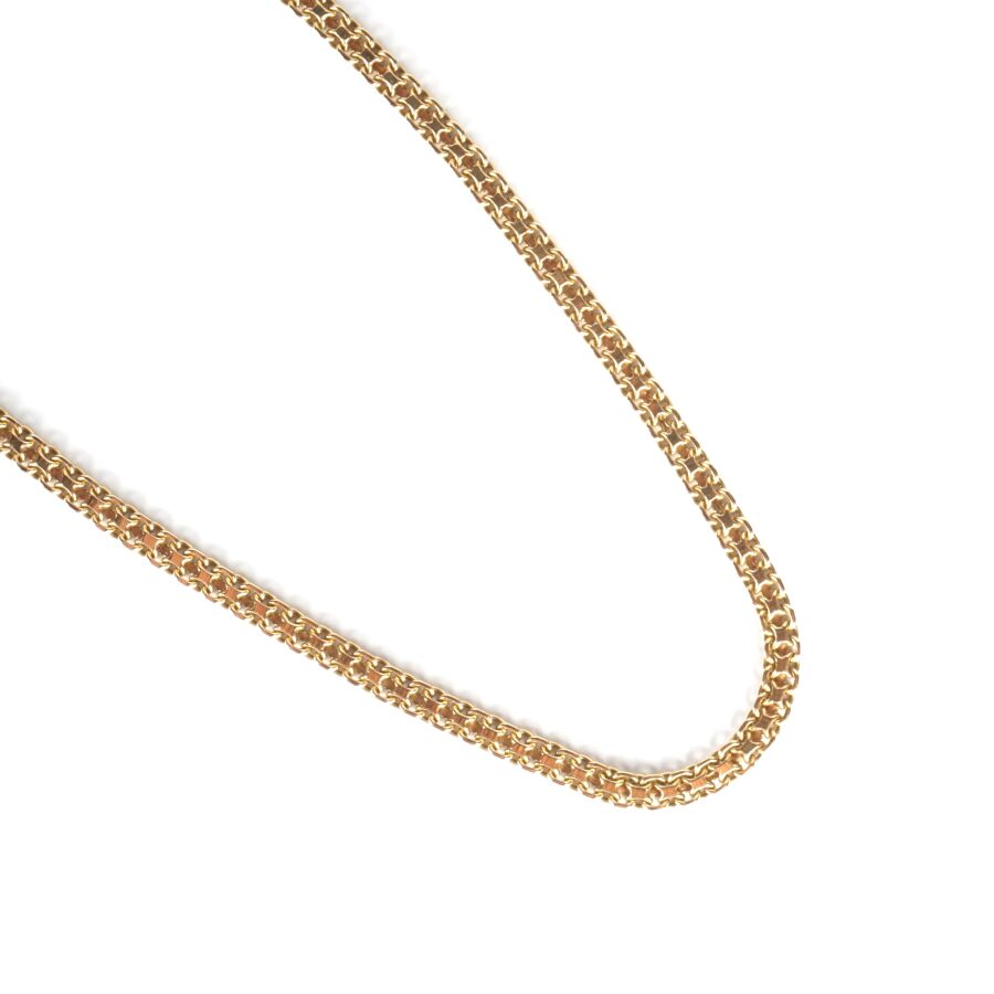 Collier en or jaune 18K (750/oo), maille plate tressée, fermoir à anneau ressort, L. 62 cm. Larg. 3 mm. Poids brut : 14.9 g environ
