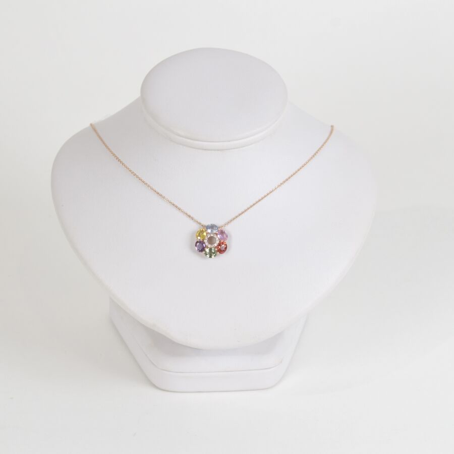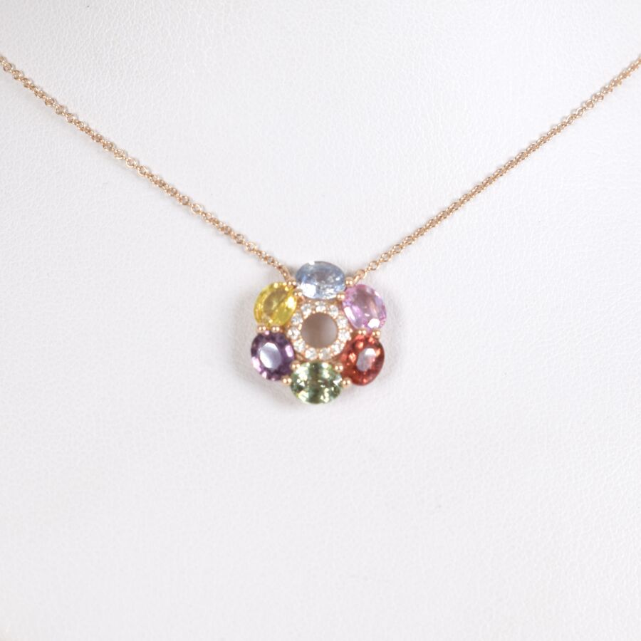 Collier en or rose 18K (750/oo) ornée de diamants taille moderne pour environ 0.1 ct dans un entourage de saphirs orange, vert, violet, jaune, bleu et rose de taille ovale calibrant environ 2.6 ct, L. 45 cm. Poids brut : 1.9 g environ.
