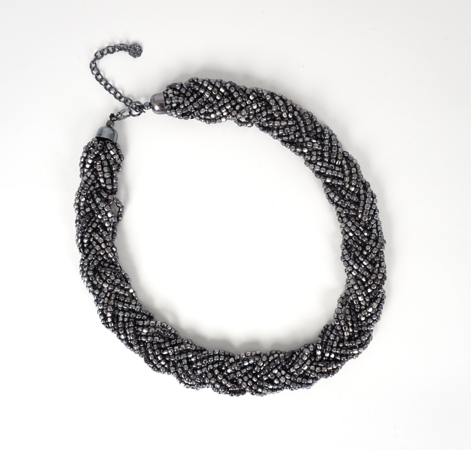Collier fantaisie à multiples rangs tressés de perles anthracites, L. 49 cm.