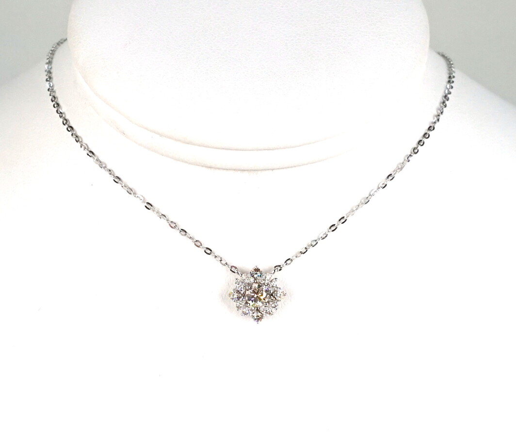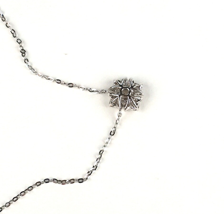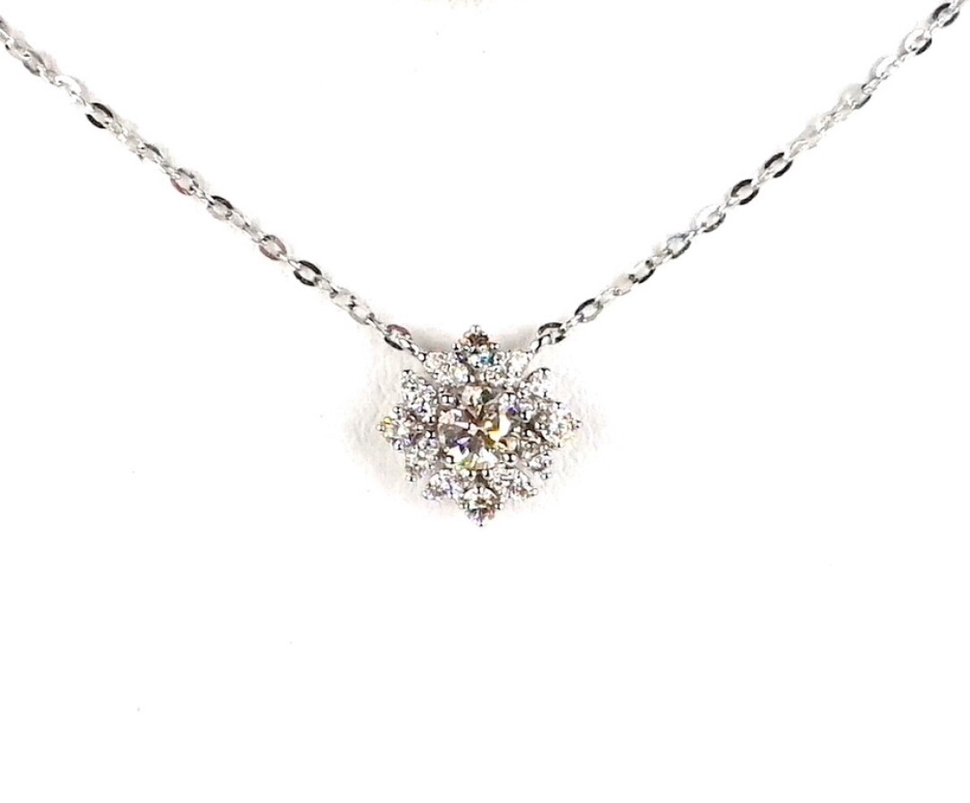 Collier "Fleur" en or blanc 18K (750/oo) la chaine maille forçat retenant un pendentif fixe serti de 21 diamants ronds calibrant ensemble 0.35 ct, fermoir mousqueton, L. de 38.5 à 43 cm. Poids brut : 1.35 g environ.