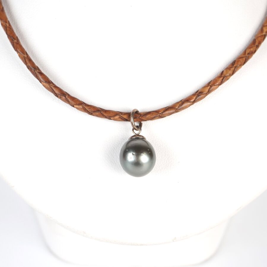Collier "Perle" formé d'un cordon en cuir marron tressé, retenant un pendentif en argent (925/oo), serti d'une perle de Tahiti 9/10 mm, fermoir mousqueton, L. 44 cm. Poids brut : 4.8 g environ.