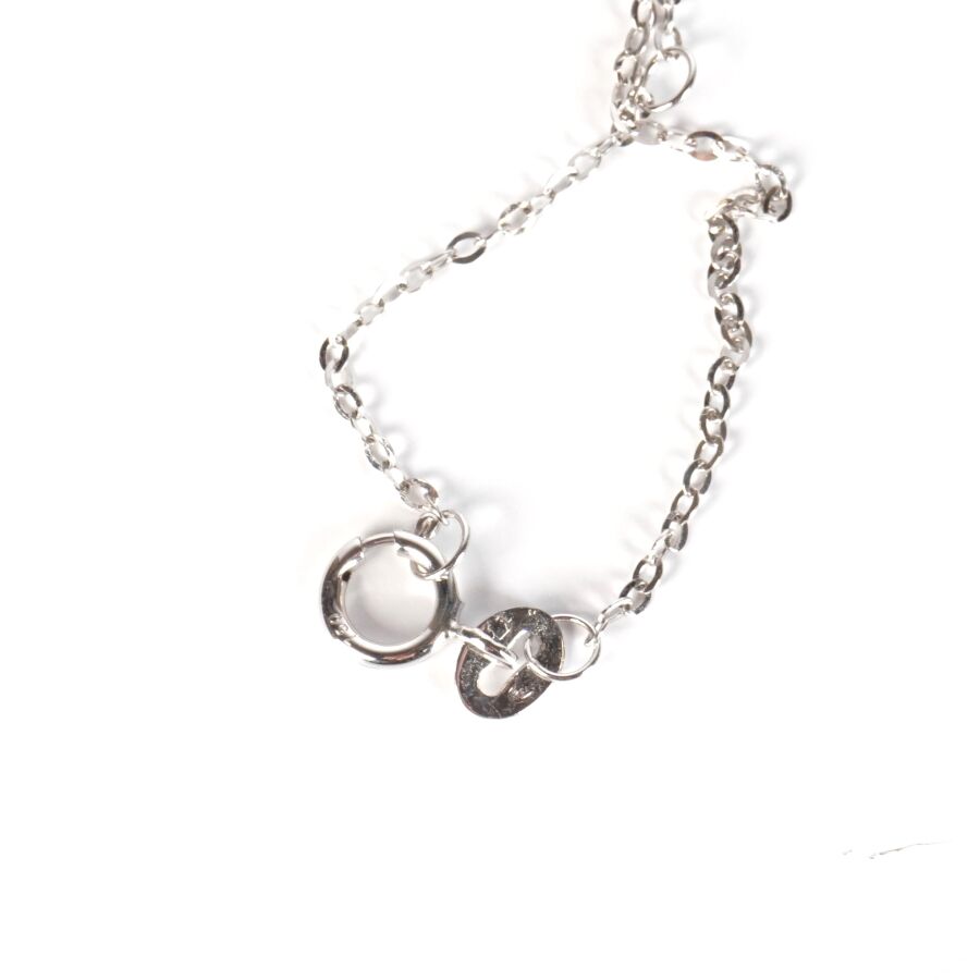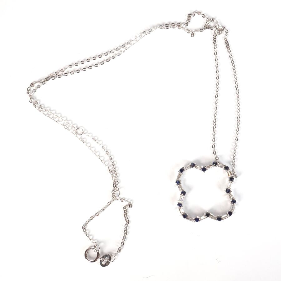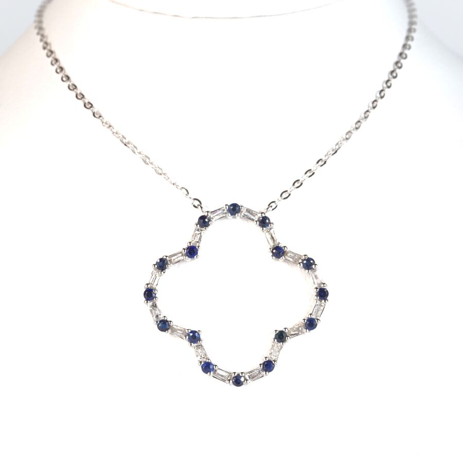 Collier "Polylobé" en or gris 18K (750/oo) serti de 16 diamants taille tapers calibrant au total 0.31 ct environ, intercalés de 16 saphirs de couleur bleu, taille ronde, calibrant ensemble 0.32 ct environ, fermoir à anneau ressort, L. 40 cm. Dim. Motif : 22 x 22 mm. Poids brut : 2 g environ.